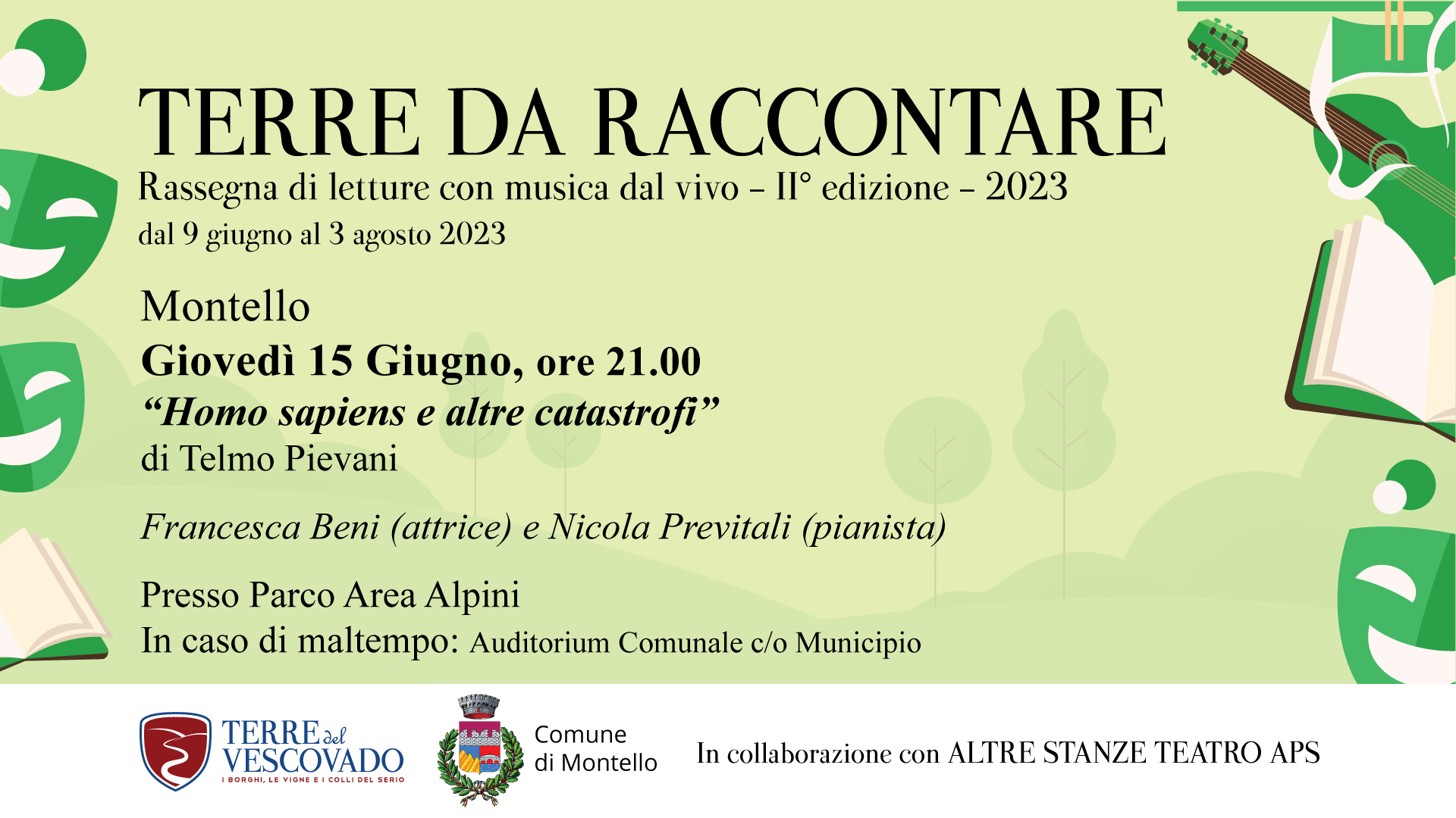 Terre del Vescovado, in collaborazione con Francesca Beni di Altre Stanze Teatro, organizza la 2ยฐ edizione della rassegna di letture e musica dal vivo โTerre da raccontareโ. Il secondo appuntamento si terrร nel comune di Montello.