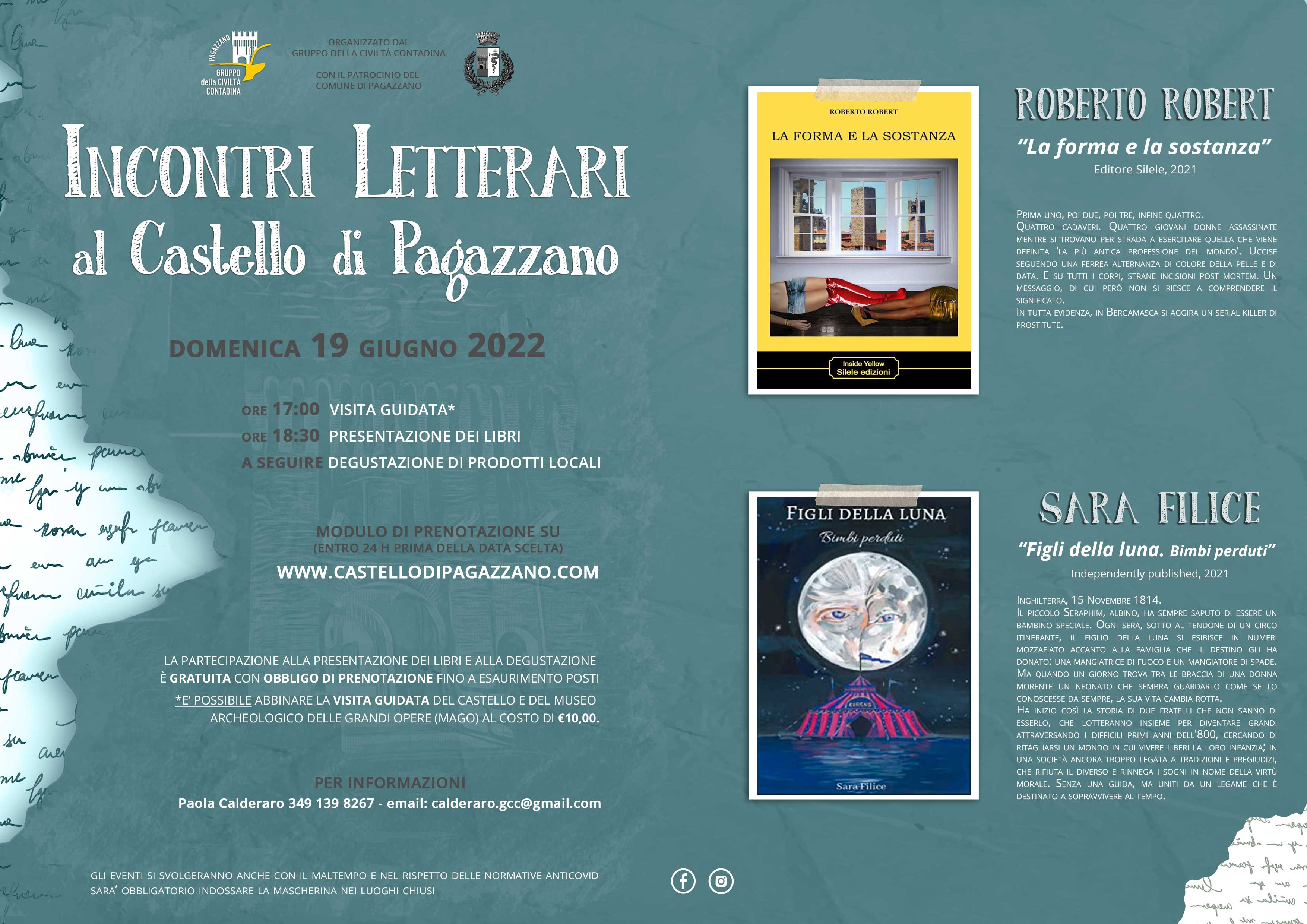 Il 19 giugno saranno ospiti il giallista bergamasco Roberto Robert e la scrittrice Sara Filice e presenteranno le loro ultime opere. Per chi lo desidera sarà possibile partecipare ad una visita guidata del castello prima dell'evento e a seguire il Gruppo della Civiltà Contadina proporrà una degustazione di prodotti locali.