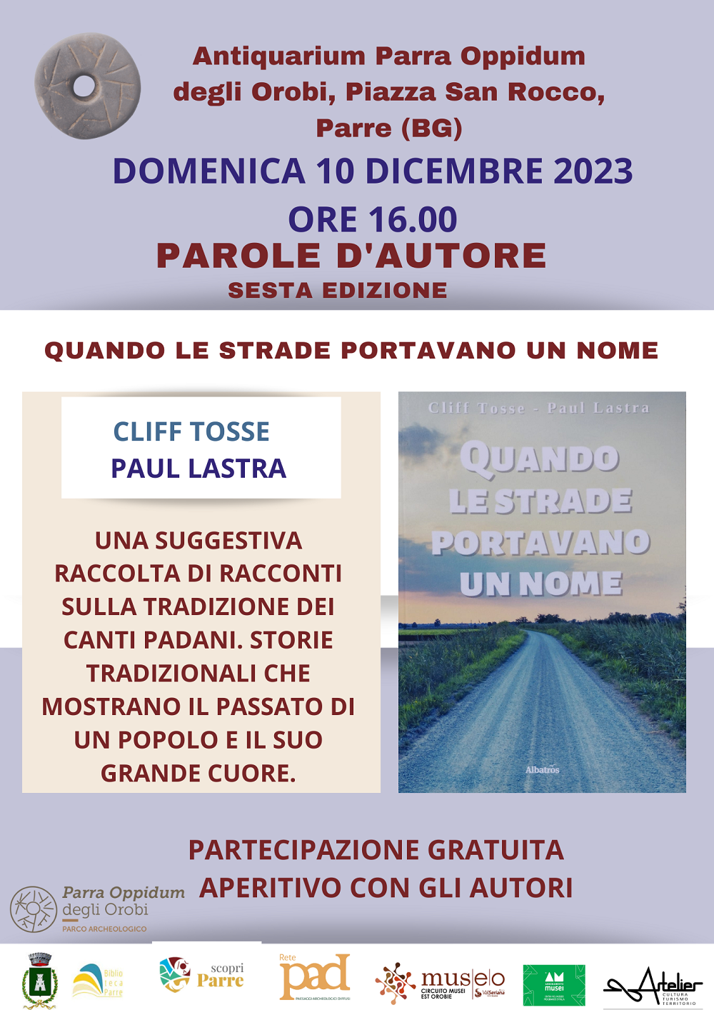 Artelier organizza la sesta edizione di Parole d'Autore. Appuntamento domenica 10 dicembre alle ore 16.00 presso l'Antiquarium Oppidum degli Orobi si terrà la presentazione del libro "Quando le strade portavano un nome" di Cliff Tosse e Paul Lastra.