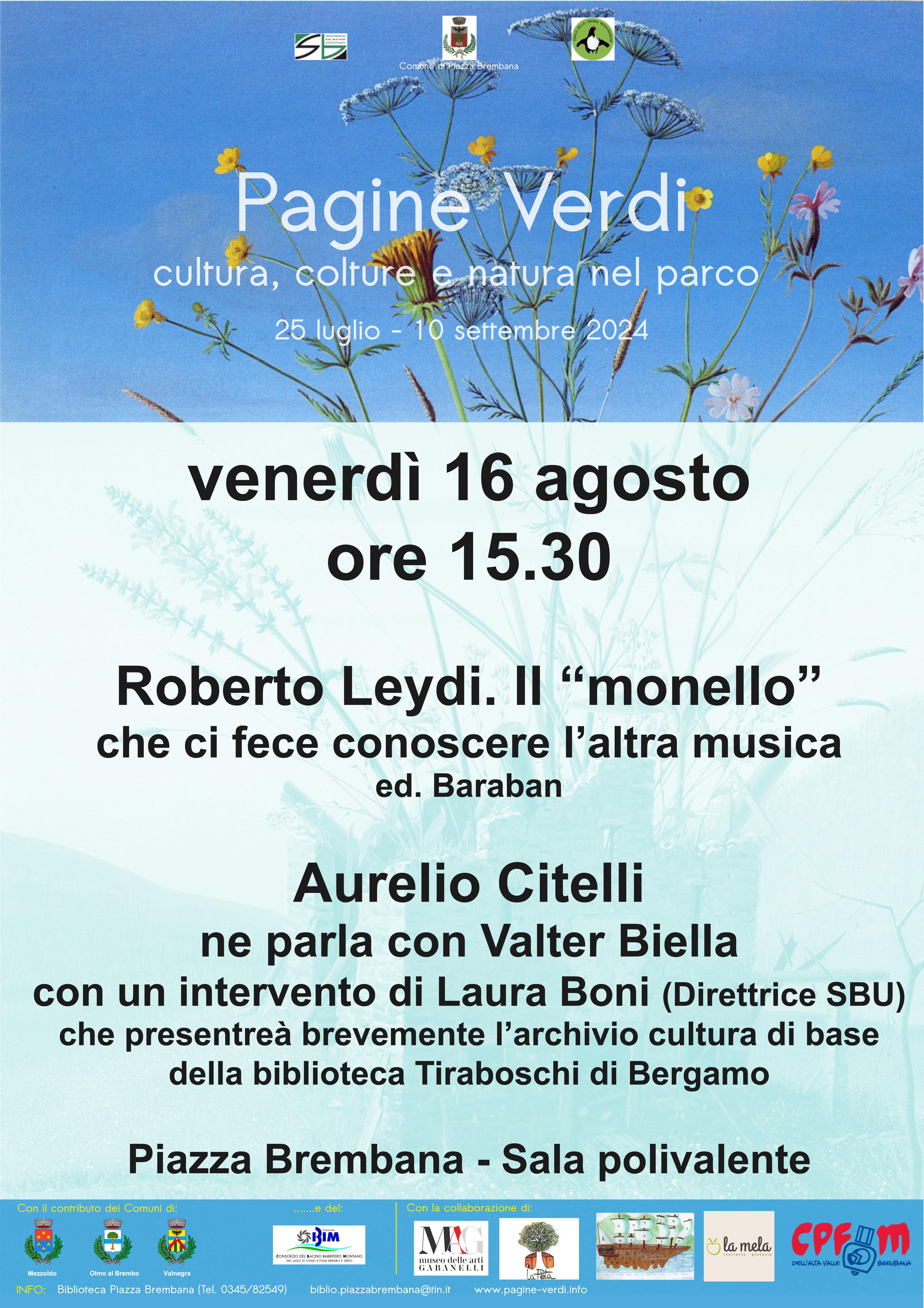 Quinto appuntamento della rassegna Pagine verdi. In sala Polivalente a Piazza Brembana alle ore 15.30 Aurelio Citelli presenterà uno studio da lui curato sull'etnomusicologo Roberto Leydi. Con intervento di Valter Biella. A seguire Laura Boni, direttrice SBU, illustrerà brevemente l'Archivio della Cultura di Base della biblioteca Tiraboschi presso il quale è conservato l'archivio Leydi