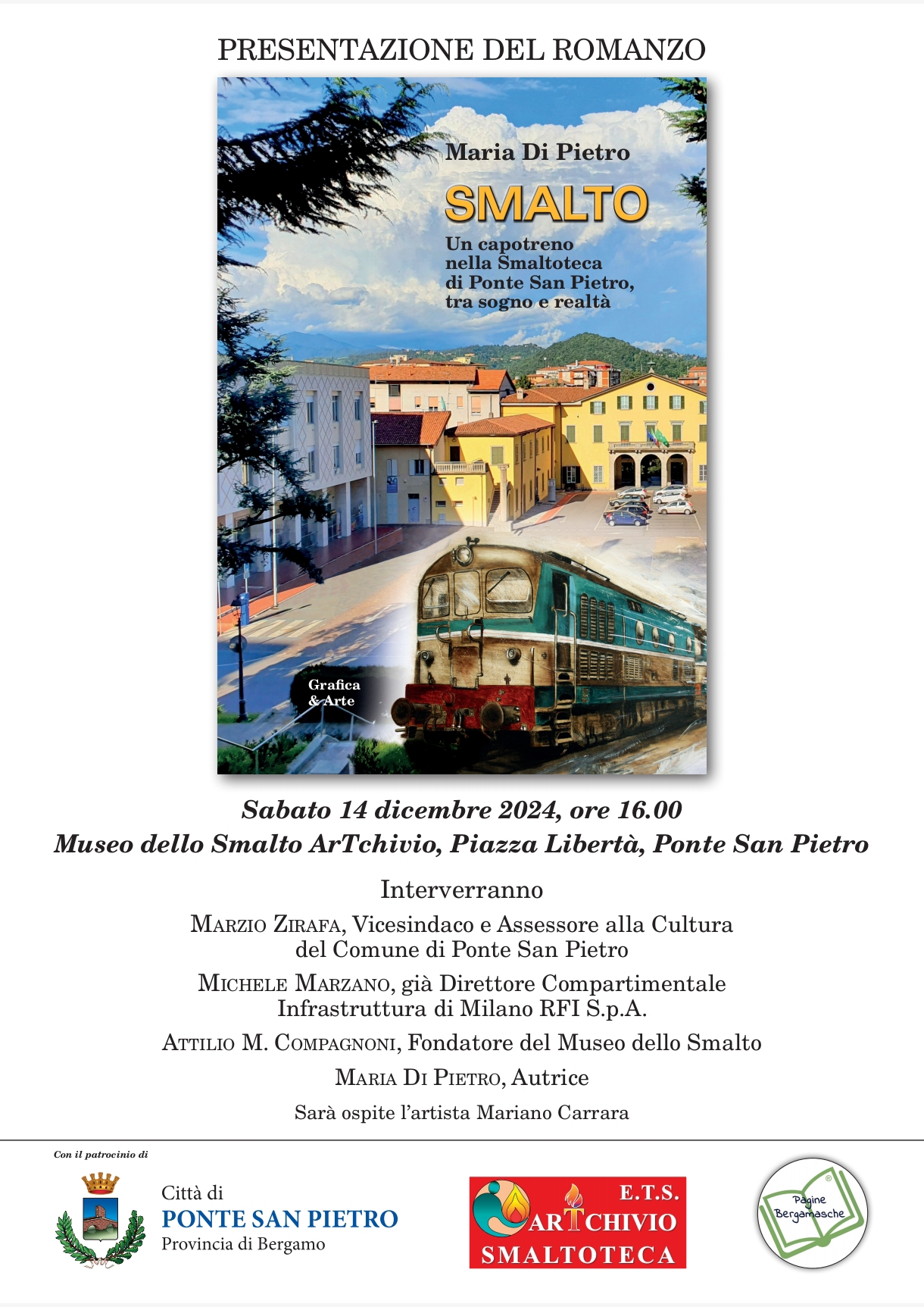 Presentazione del romanzo di Maria Di Pietro. Il libro, dal finale surreale, vuole portare a conoscenza del pubblico il Museo dello Smalto di Ponte San Pietro ripercorrendo al contempo la storia degli elettrotreni italiani