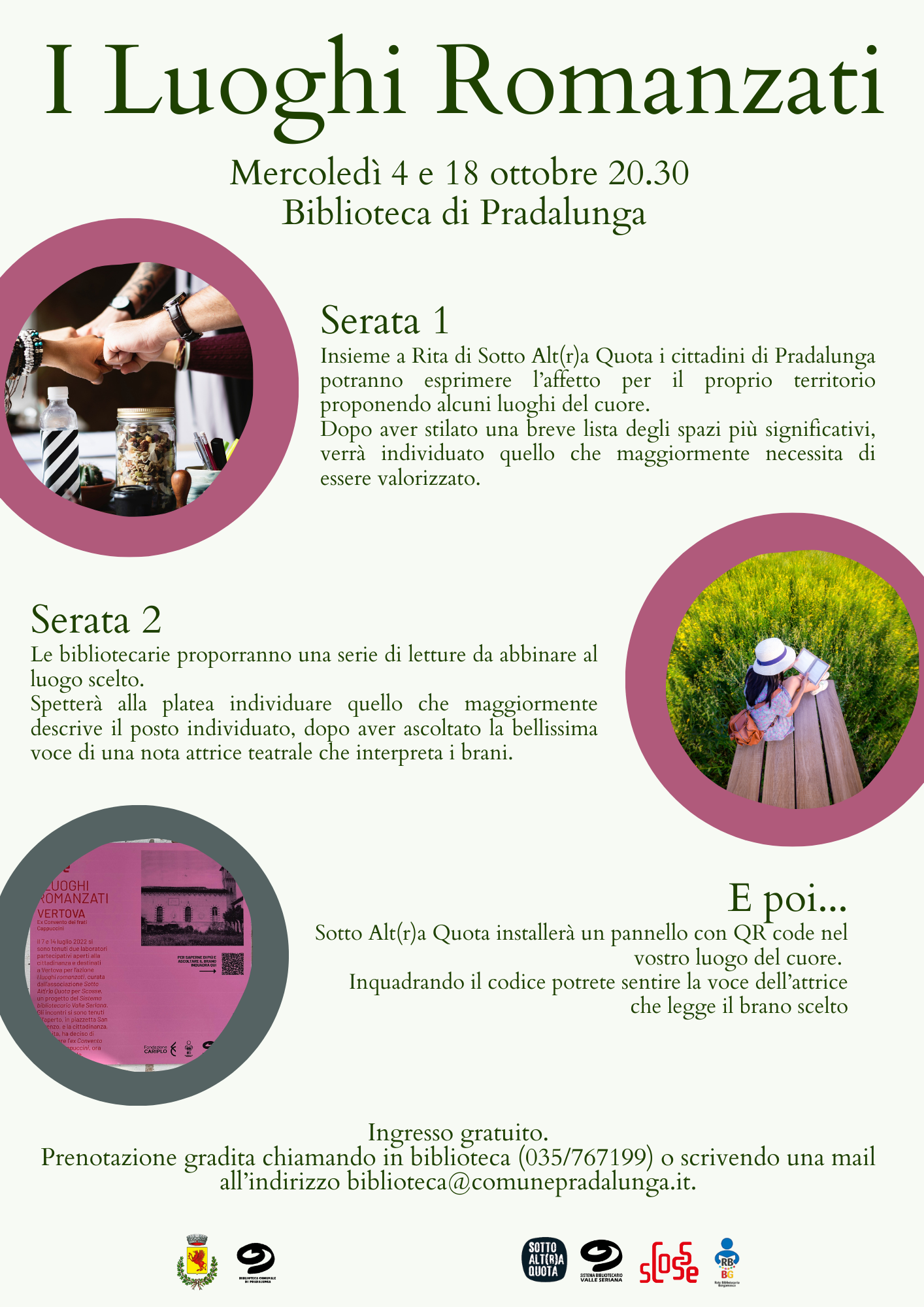 Insieme a Rita di Sotto Alt(r)a Quota i cittadini di Pradalunga potranno esprimere l’affetto per il proprio territorio proponendo alcuni luoghi del cuore. Dopo aver stilato una breve lista degli spazi più significativi, verrà individuato quello che maggiormente necessita di essere valorizzato.