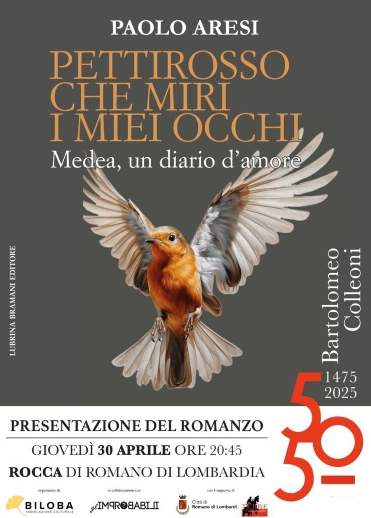 L'Associazione Biloba, in collaborazione con Gli improbabili, con il supporto della Cittร di Romano di Lombardia e le Terre Colleonesche, vi invita alla presentazione del libro ยซPettirosso che miri i miei occhi. MEDEA, un diario d'amoreยป, romanzo storico ambientato in luoghi Colleoneschi scritto da Paolo Aresi.