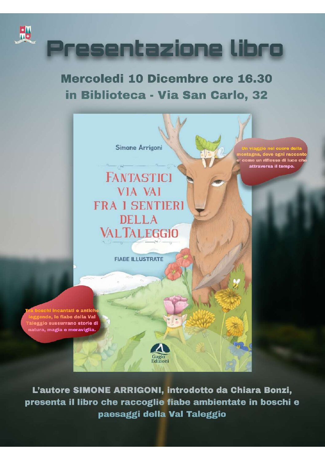 Mercoledì 10 dicembre alle 16.30 l'autore Simone Arrigoni presenterà il suo libro Fantastici Via vai fra i sentieri della Val Taleggio, una raccolta di fiabe ambientate nei boschi e paesaggi della Val Taleggio.