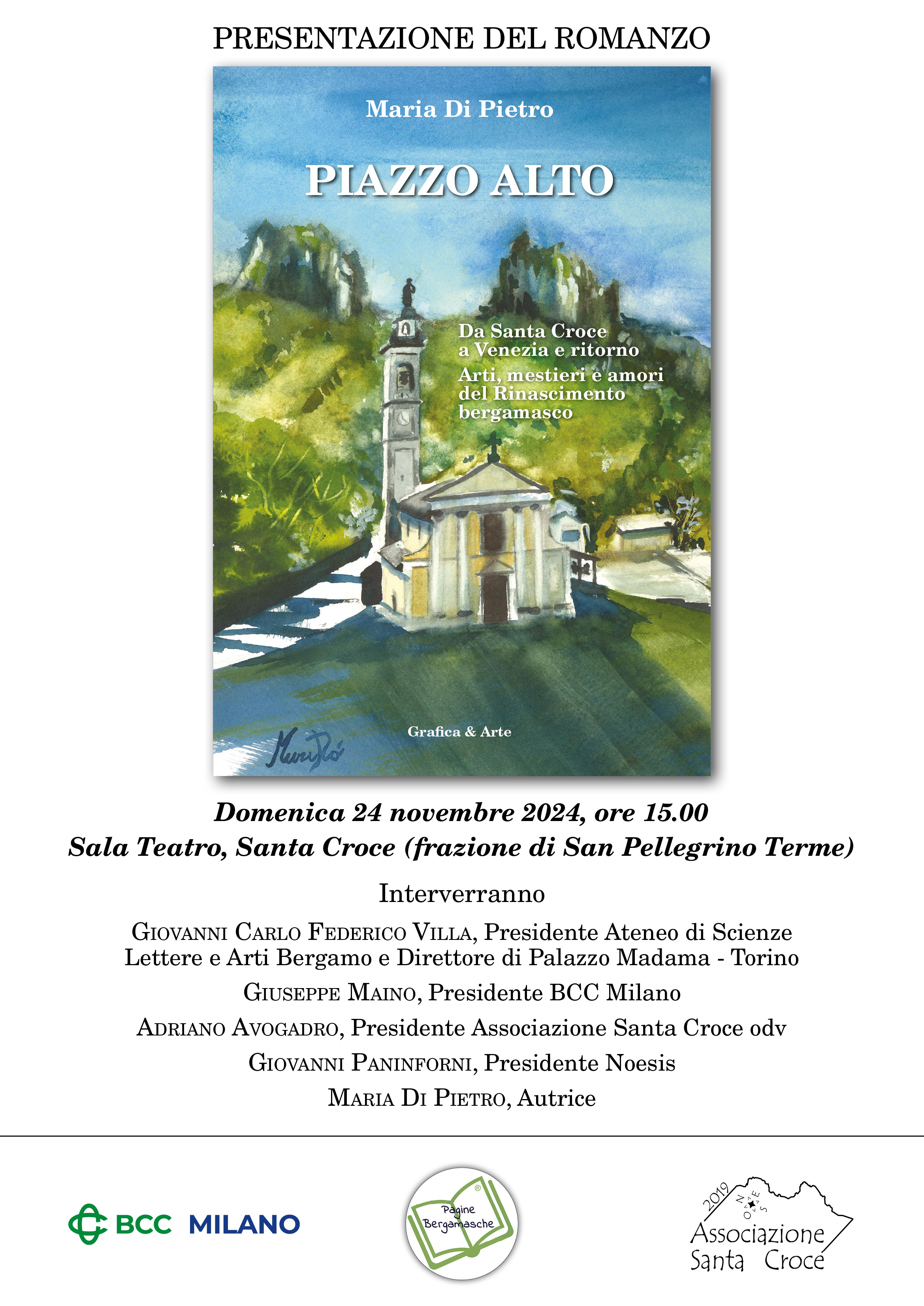 Presentazione del romanzo di Maria Di Pietro. Il libro riprende l'epopea dei pittori da Santacroce che a Venezia ebbero botteghe d’arte, ma che erano originari della frazione di Santa Croce di San Pellegrino Terme, all'epoca denominata Piazzo Alto.