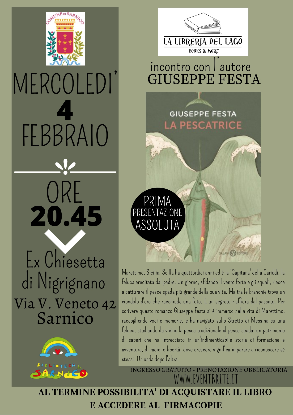 Mercoledì 4 febbraio, alle 20:45, si terrà l'incontro con l'autore Giuseppe Festa, che presenterà in anteprima il suo nuovo romanzo "La pescatrice", presso l’ex Chiesetta di Nigrignano di Sarnico.