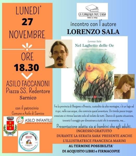 Lunedì 27 novembre, alle ore 18.30, presso l'Asilo Faccanoni di Sarnico, si terrà l'incontro con l'autore sarnicese Lorenzo Sala che presenterà il suo primo libro "Nel Laghetto delle Oe".