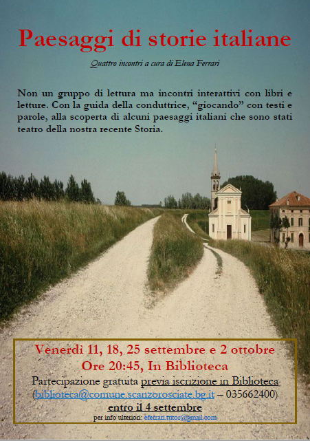 Non un gruppo di lettura ma incontri interattivi con libri e letture. Con la guida della conduttrice, "giocando" con testi e parole, alla scoperta di alcuni paesaggi italiani che sono stati teatro della nostra recente storia.