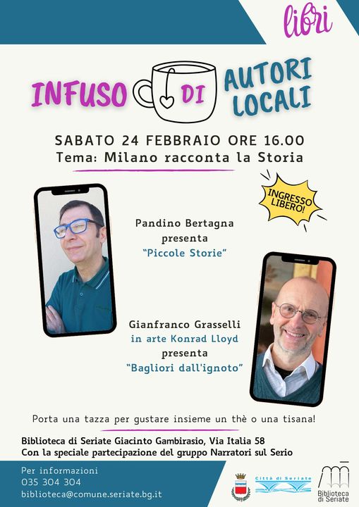 La Biblioteca civica di Seriate presenta la rassegna "Infuso di autori locali". Il primo incontro di quest'anno avrà come tema "Milano racconta la storia". Gli autori che prenderanno parola saranno Pandino Bertagna, con la presentazione di "Piccole Storie" e Gianfranco Grasselli (in arte Konrad Lloyd) che presenta "Bagliori dall'ignoto".