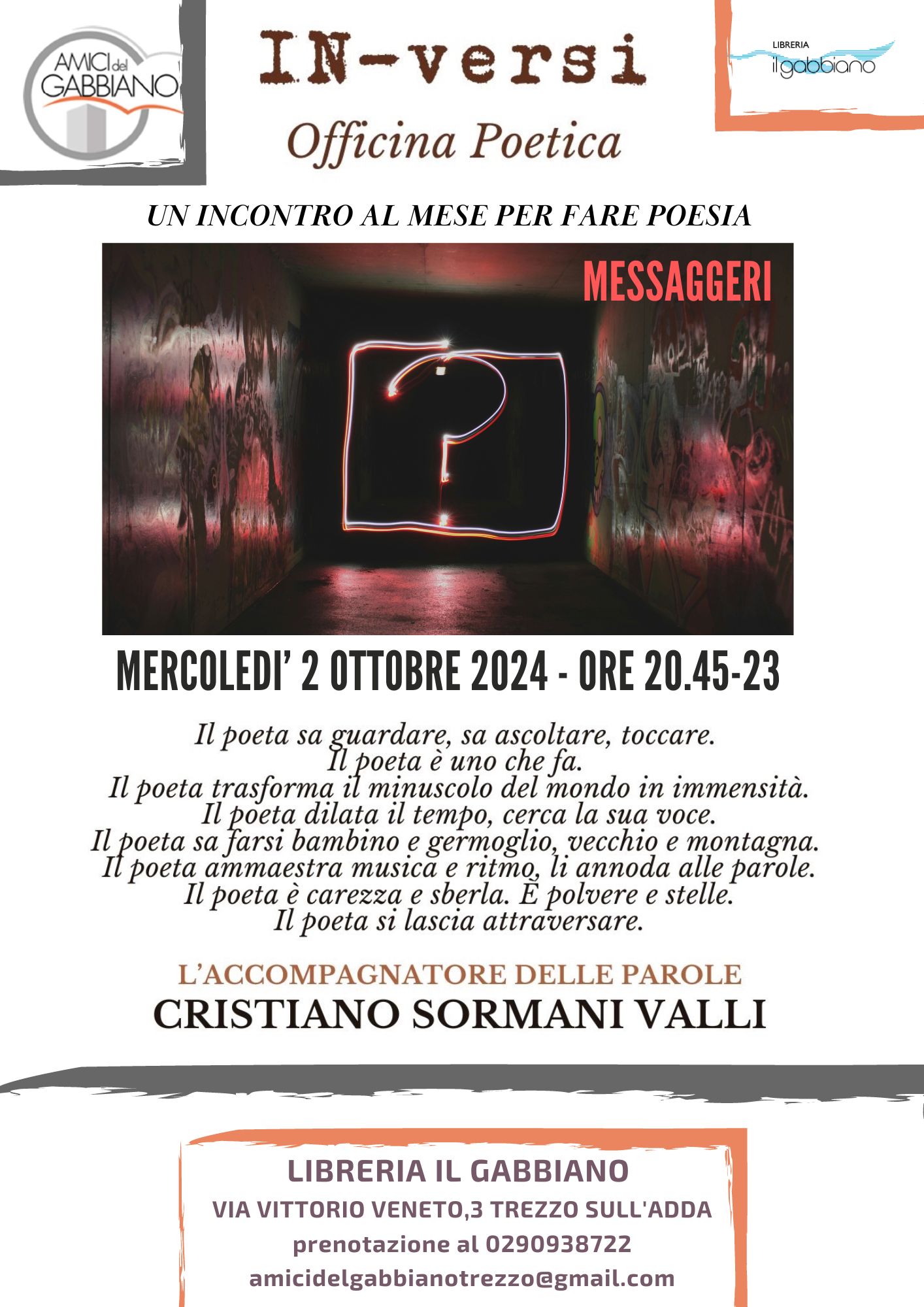 La Libreria Il Gabbiano ospita "In-versi: Officina Poetica", un ciclo di incontri dedicati alla poesia. Il primo appuntamento, in programma mercoledì 2 ottobre, vedrà la partecipazione di Cristiano Sormani Valli.