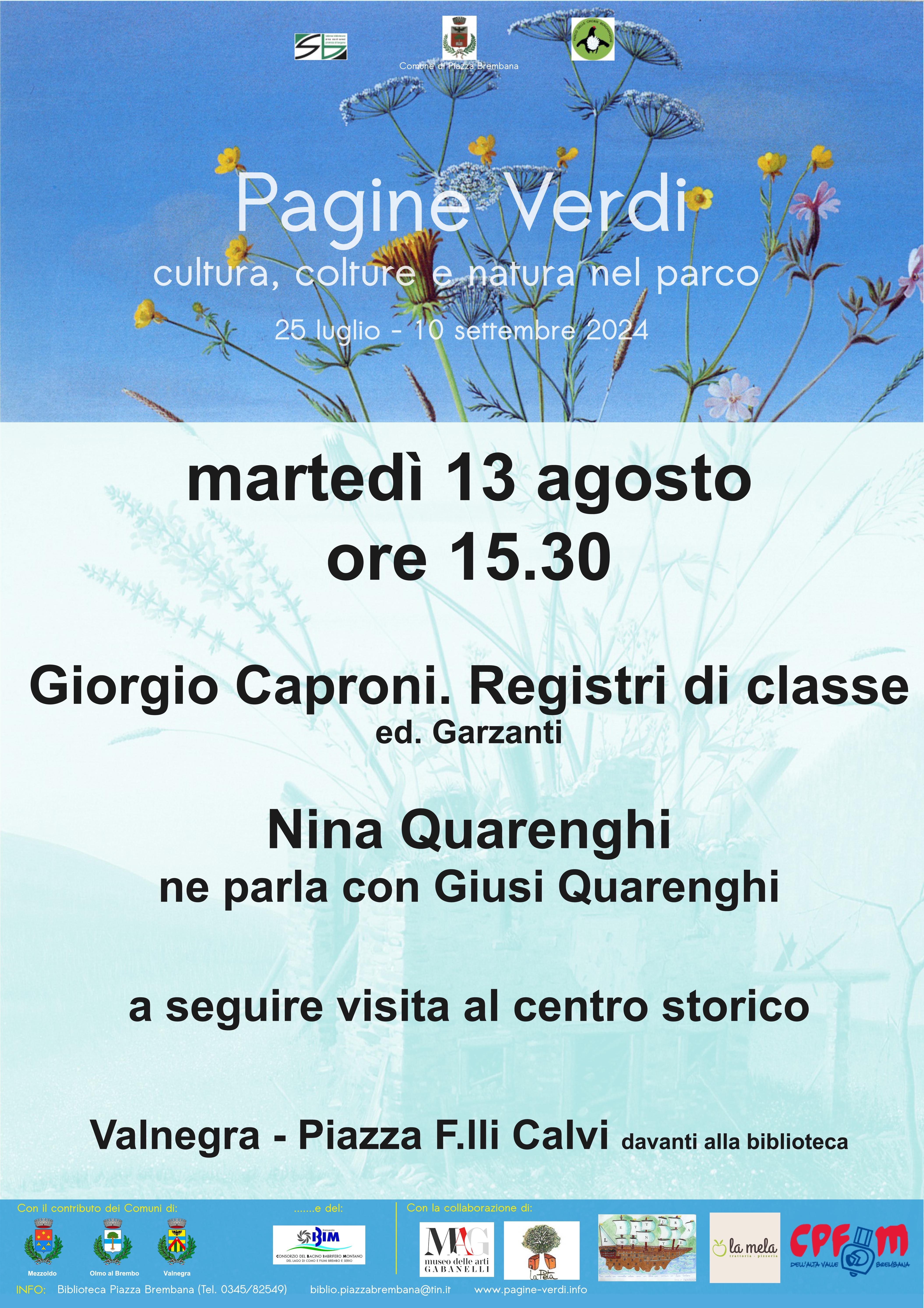 Quarto incontro della rassegna Pagine verdi. A Valnegra in Piazza F.lli Calvi davanti alla biblioteca, Nina Quarenghi presenterà con Giusi Quarenghi il suo lavoro "Giorgio Caproni. Registri di classe".