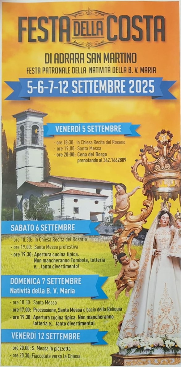 Tre giorni di fede, tradizione e convivialitร nel cuore di Adrara San Martino: celebrazioni religiose, piatti tipici, intrattenimento e momenti di comunitร per onorare la Nativitร della Beata Vergine Maria nella storica Festa della Costa.