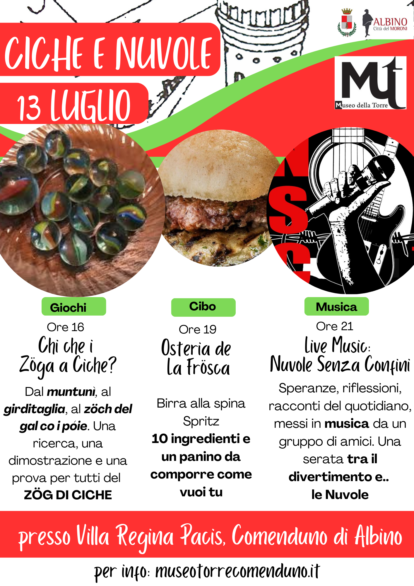 Il Museo della Torre di Comenduno presenta un evento di ricerca e dimostrazione di uno dei giochi ormai dimenticati che ha segnato l'infanzia di generazioni di bambini. A seguire un concerto dei Nuvole Senza Confini. Servizio bar e cena presso l'Osteria de la Frosca.Ore 16: CHI CHE I ZÖGA A CICHE?Giocare a biglie è un divertimento antico e anche nelle nostre comunità locali è stato, da che ci si ricordi, molto praticato, soprattutto da chi è stato bambino nella seconda metà del novecento.Dopo la guerra, negli anni cinquanta, le biglie, da palline di terracotta qual erano state per secoli, si evolvono in biglie di vetro e marmorate e vengono molto utilizzate in giochi anche complessi e molto partecipati di ragazzini che d’estate, liberi dalla scuola e sotto il sole, giocavano e trafficavano con le ciche nei diversi spazi di terra battuta del paese.Dal semplice curìs iddré, al più grossolano muntunì, il surreale ugì, büsa o còla, dal creativo girditaglia, fino al tecnico zöch del gal co i póie, giocare a biglie è stato un bell’esercizio di impegno e di sopravvivenza, nel senso de l’imparà a stà al mond per generazioni di bambini del nostro paese.Ci pare piacevole l’idea di passare insieme un pomeriggio d’estate, a giocare e a raccontare del zöch di ciche in cui cercheremo di attraversare, anche ricostruendole insieme, pratiche e suggestioni di questo bel divertimento, guidati da alcune persone che, a modo loro, non hanno mai smesso di giocare.....Ore 19: L’OSTERIA DE LA FROSCAStrinù, formaggio, wurstel, verdure grigliate ed altri ingredienti per comporti il panino più gustoso, che puoi appunto crearti in base ai tuoi gusti.Inoltre un bar con birra alla spina, spritz e molto altro per accompagnarti nella giornataOre 21: LIVE MUSIC con i NUVOLE SENZA CONFINILa band si presenta così..Perché abbiamo scelto questo nome: Nuvole Senza Confini... Il pensiero che ci accompagna è che come le nuvole siamo di passaggio su questa terra, che è piccola, quasi insignificante rispetto all’immensità dell’universo per cui i confini, tanto cari a tutti i potenti, non hanno nessun significato e ancor meno significato hanno la violenza, le guerre, la distruzione del pianeta, lo sfruttamento dell’uomo sull’uomo. Siamo convinti che l’unica cosa che rimarrà alla fine del nostro passaggio, perché tutti siamo di passaggio, sarà l’amore e l’amicizia che abbiamo saputo dare e raccogliere.I pezzi che suoniamo sono stati scritti e musicati da noi e raccontano del nostro vissuto, delle nostre paure, delle nostre speranze. Sono le nostre riflessioni che nascono dal quotidiano e che abbiamo il piacere di mettere in musica perché siamo convinti che suonare sia una cosa bellissima e farlo con gli amici è ancora più bello e significativo. In noi non c’è ricerca di successo o di affermazione di sé, ma la consapevolezza della bellezza dello stare insieme, del suonare insieme, nel far qualcosa che ci piace, sperando che tutto questo possa essere anche di vostro gradimento.