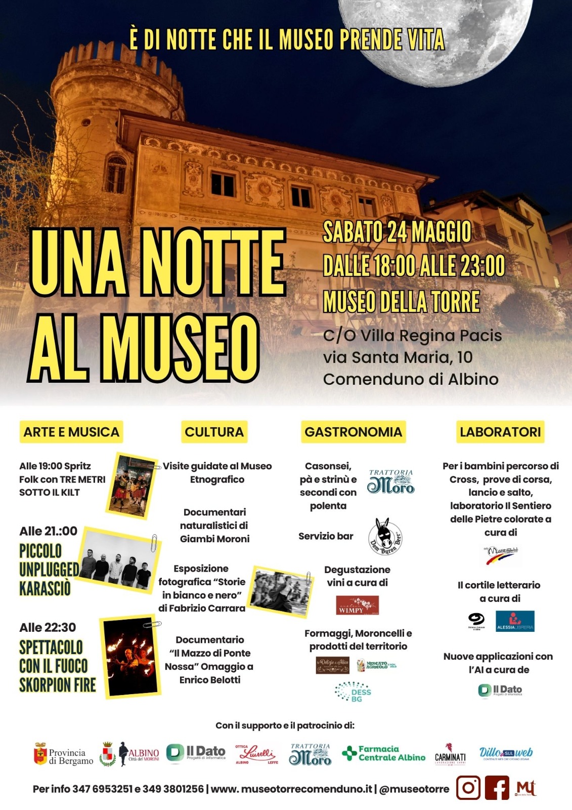 Seconda edizione in chiave primaverile dellโevento che trasforma il Museo Etnografico in un cuore pulsante della cittร . Musica, cultura, laboratori per adulti e bambini, enogastronomia riempiranno gli spazi della Villa Regina Pacis, dando spazio ad associazioni, progetti, attivitร commerciali di Albino. Una serata per tutti, in cui potersi muovere fra diverse attivitร e conoscere diverse esperienze presenti sul nostro territorio. Uno spazio di incontro e proposte da conoscere e da vivere. Si inizierร dalle 18, con diverse attivitร per le famiglie, fino alle 23, momento in cui la luna illuminerร questo bellissimo spazio. Con il patrocinio del Comune di Albino e della Provincia di Bergamo. Possibilitร di cenare in loco con la proposta curata dalla Trattoria Moro a base di Paโ e Strinรน, Casonsei, Polenta e Formaggi o selvaggina. Per tutti i gusti e tutte le tasche! Di seguito una presentazione delle proposte durante la serata.