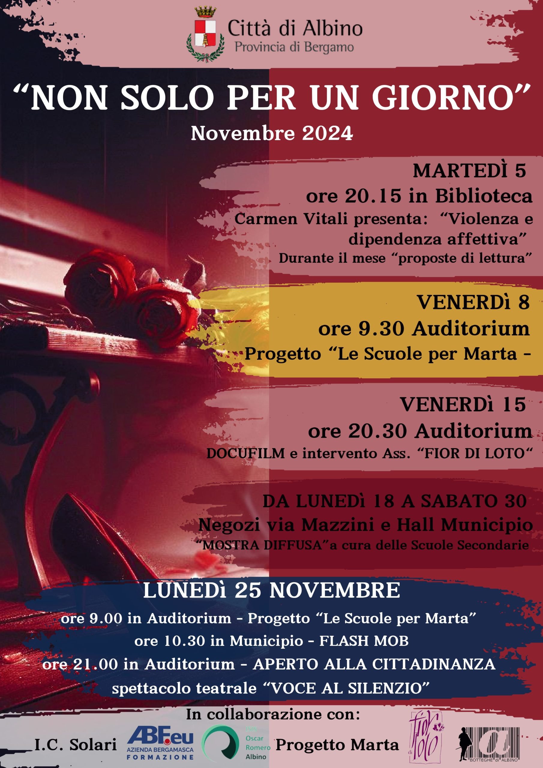 Iniziative promosse da servizi politiche giovanili, biblioteca e cultura, assessorato p.i., in collaborazione con I.C. Solari, ABF Azienda Bergamasca Formazione, Istituto Oscar Romero Albino, Progetto Marta, Associazione Fior di Loto, Associazione Botteghe di Albino.