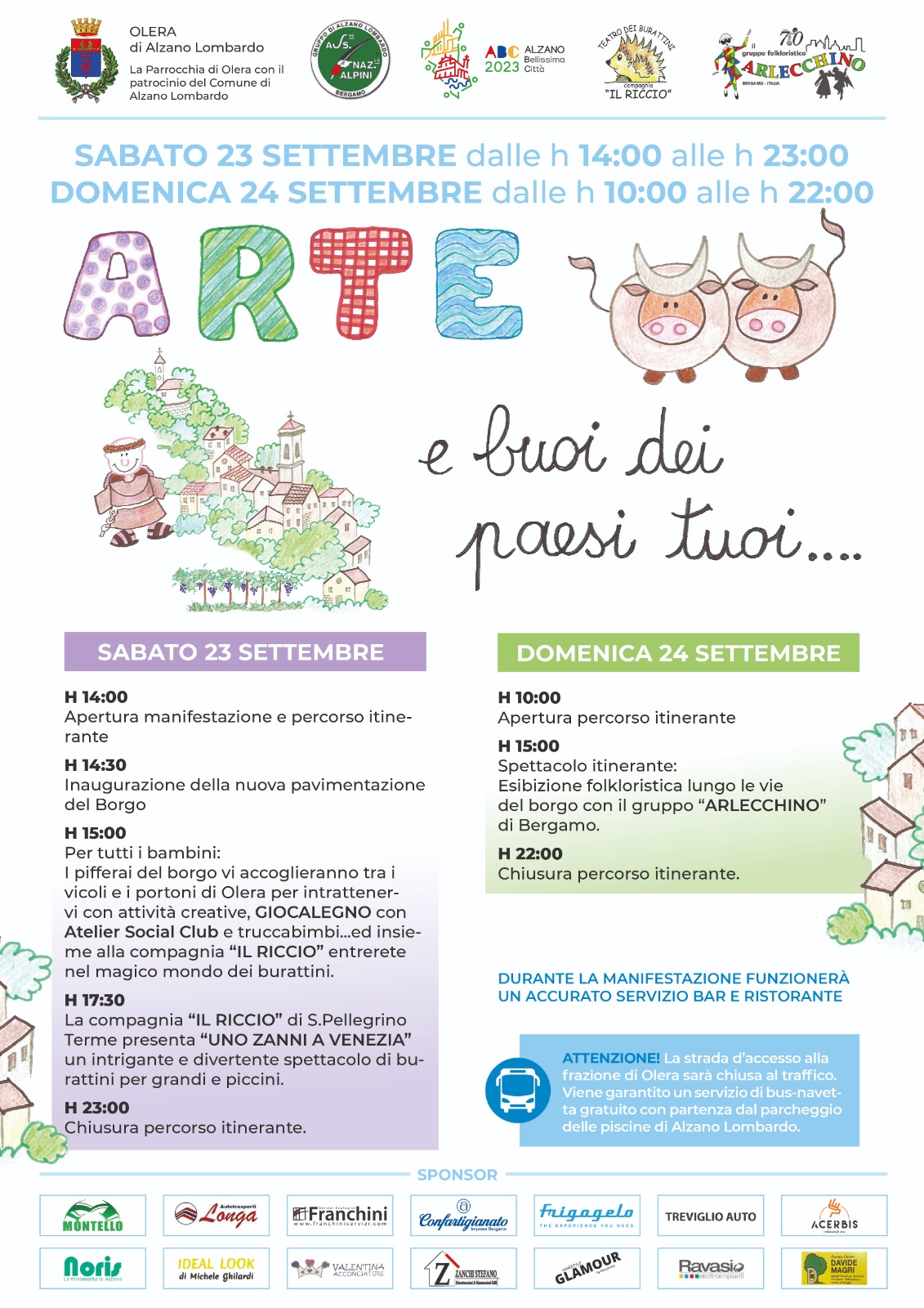 - Ore 22 chiusura del percorso itinerante La strada d'accesso alla frazione di Olera sarà chiusa al traffico. Viene garantito un servizio di bus-navetta gratuito con partenza dal parcheggio delle piscine di Alzano Lombardo.