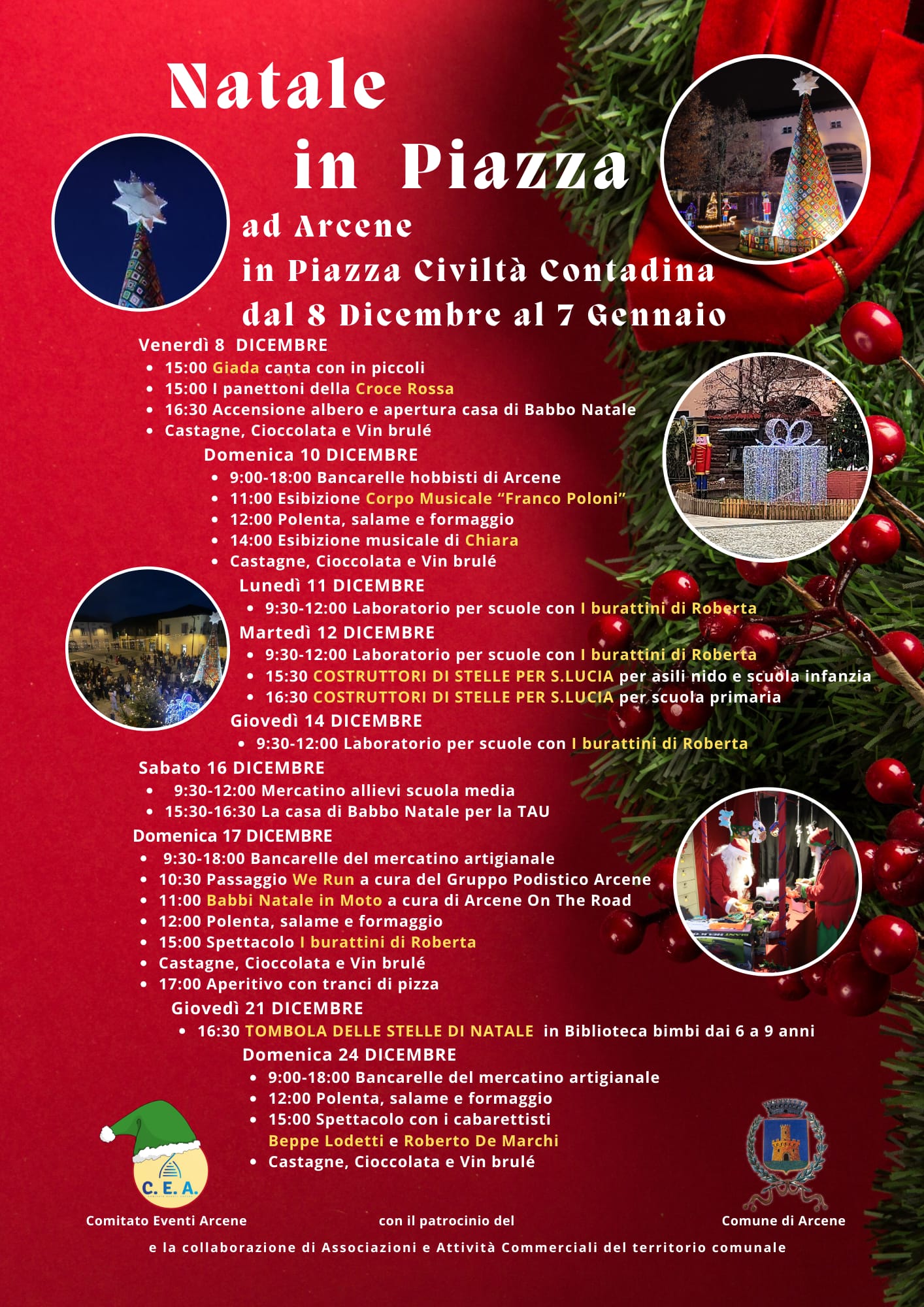 Casa di Babbo Natale, albero di Natale, spettacoli vari, Babbi Natale in moto e di corsa, bancarelle, laboratori e molto altro ancora, vi attendono in centro ad Arcene per ritornare un pò bambini.....