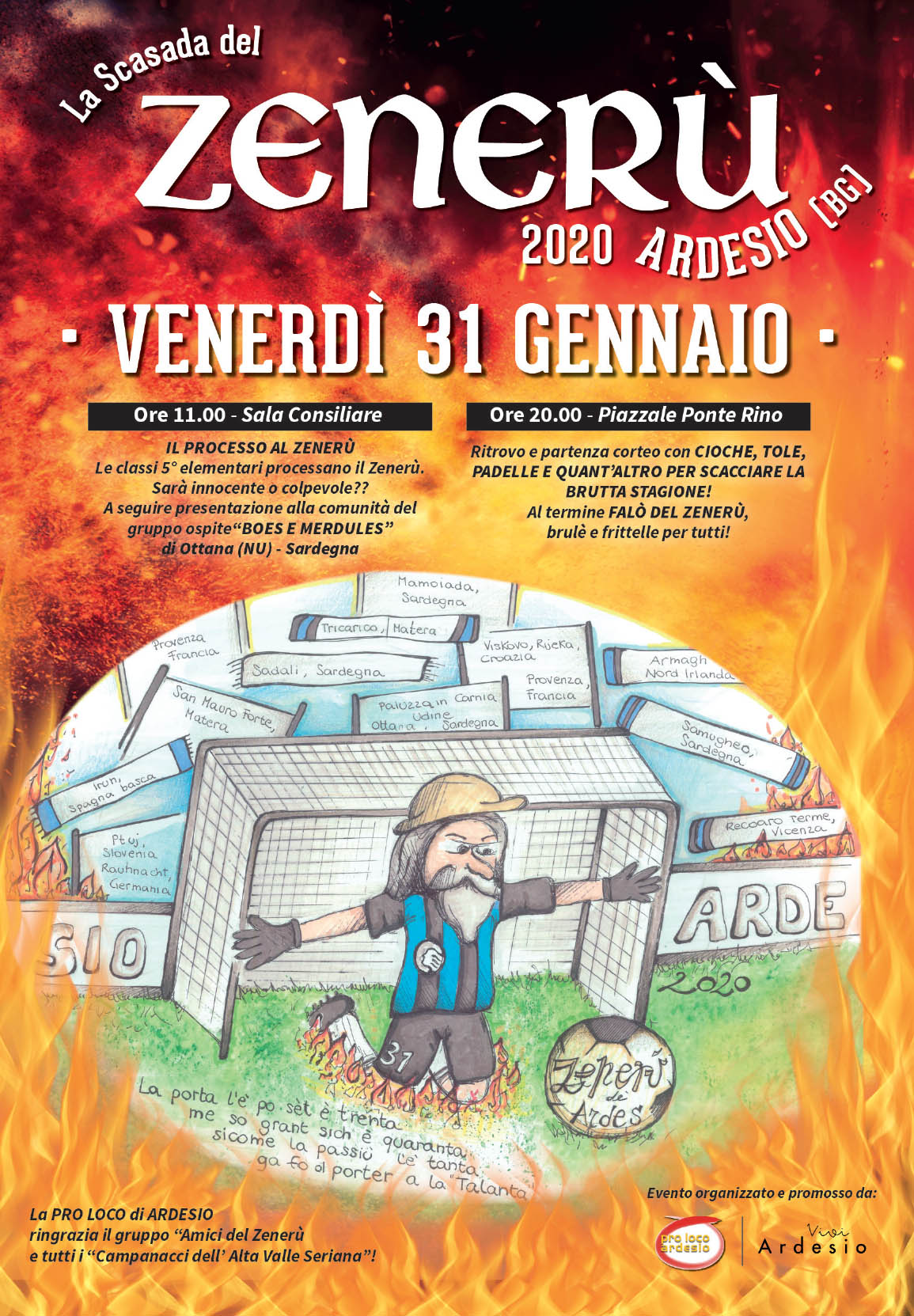 Ad Ardesio il 31 Gennaio per tradizione si scaccia l’inverno e la brutta stagione con il rumore di campanacci e il grande falò del fantoccio di Zenerù (Gennaione) nel grande evento organizzato ogni anno dalla Pro Loco Ardesio: la “Scasada del Zenerù”. Il Zenerù ricorre proprio nei gelidi giorni della merla e nell’antichità il 31 gennaio era considerato cerniera tra l’inverno e la primavera e in Alta Val Seriana, in serata, migliaia di persone si unisco agli ardesiani per “scacciare” l’inverno, il freddo e la brutta stagione, facendo un gran baccano con campanacci, latte, raganelle piccole e giganti e tutto ciò con cui si può far rumore. Una tradizione molto partecipata e che ogni anno viene condivisa con le nuove generazioni. Anche quest’anno sarà infatti riproposto il “Processo al Zenerù”, in cui i bambini e ragazzi della primaria di Ardesio saranno protagonisti la mattina del 31 alle 11 in sala consiliare. I ragazzi dovranno ascoltare testimoni a difesa e contro Zenerù per decidere il suo destino: sarà giudicato innocente o colpevole? Il falò in programma la sera di venerdì 31 gennaio preannuncia già l’epilogo.