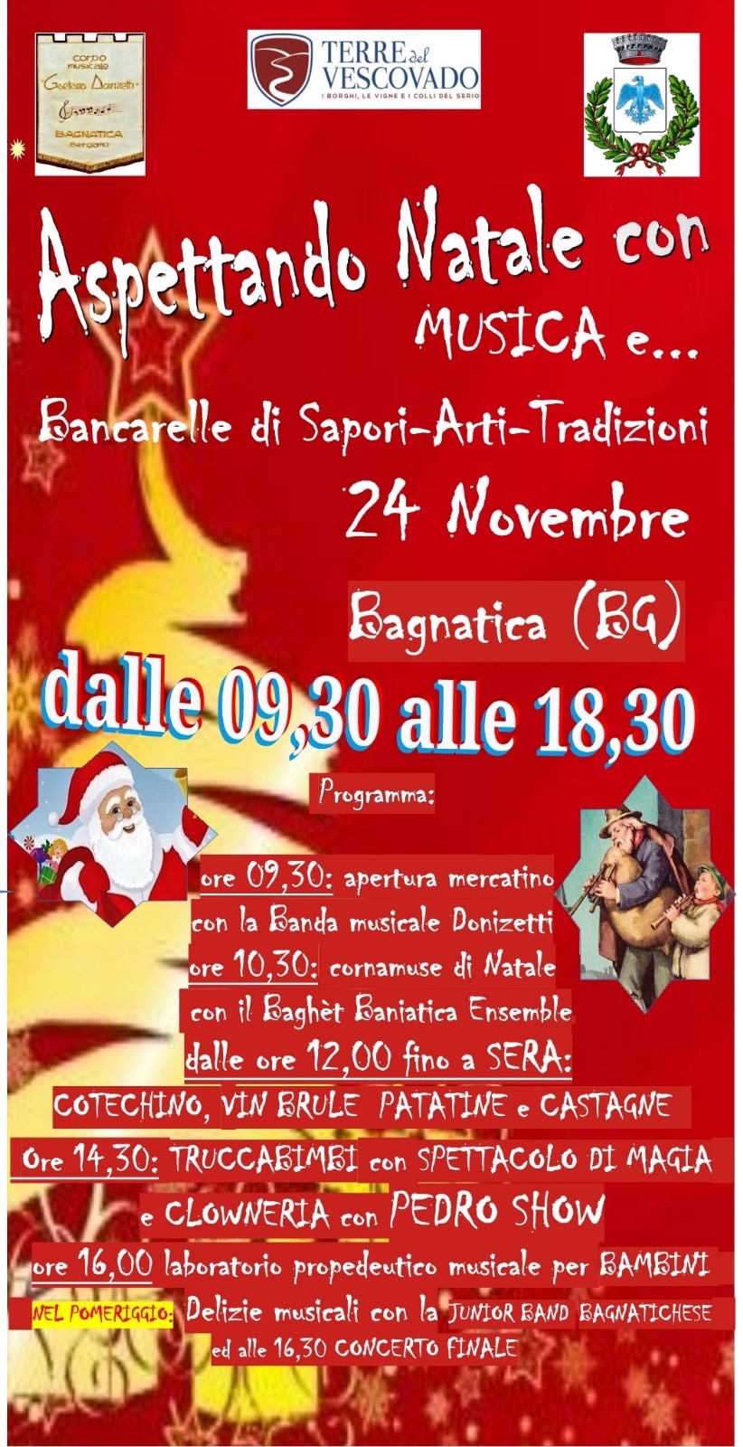Un’intera giornata da vivere, tra note festive, colori, suoni e sapori, immersi nell'atmosfera calda e accogliente di Bagnatica. Non mancate a questo appuntamento che darà il via alle festività natalizie!