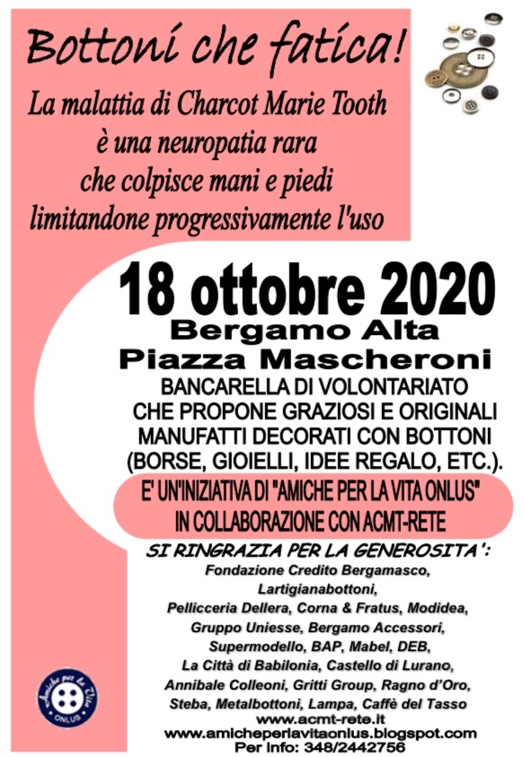 Per raccogliere fondi destinati a questi malati, adulti e bambini, l'associazione Amiche per la vita ONLUS, in collaborazione con ACMT-Rete, organizza in Piazza Mascheroni una bancarella di volontariato, dove potrete acquistare graziosi ed originali manufatti decorati con bottoni.