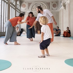 Dopo un momento iniziale in cui ognuno seduto sul suo cerchio azzurro guarda le performer danzare e ascolta i suoni live prodotti da strumenti musicali unici e originali, tutti possono entrare e danzare nello spazio scenico: la performance si costruisce insieme.