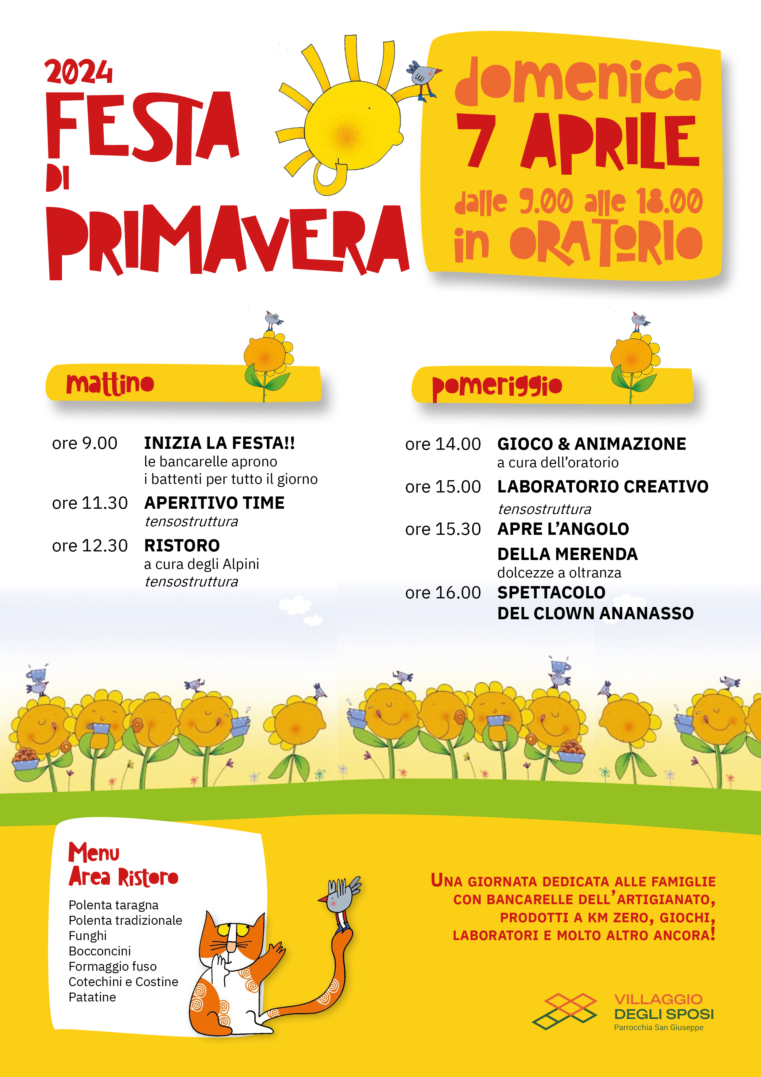 Al Villaggio degli Sposi una domenica ricca di opportunità per stare all'aria aperta dando il benvenuto alla primavera, con mercatini di artigianato e prodotti km 0, giochi e laboratori, tornei e animazione in oratorio.