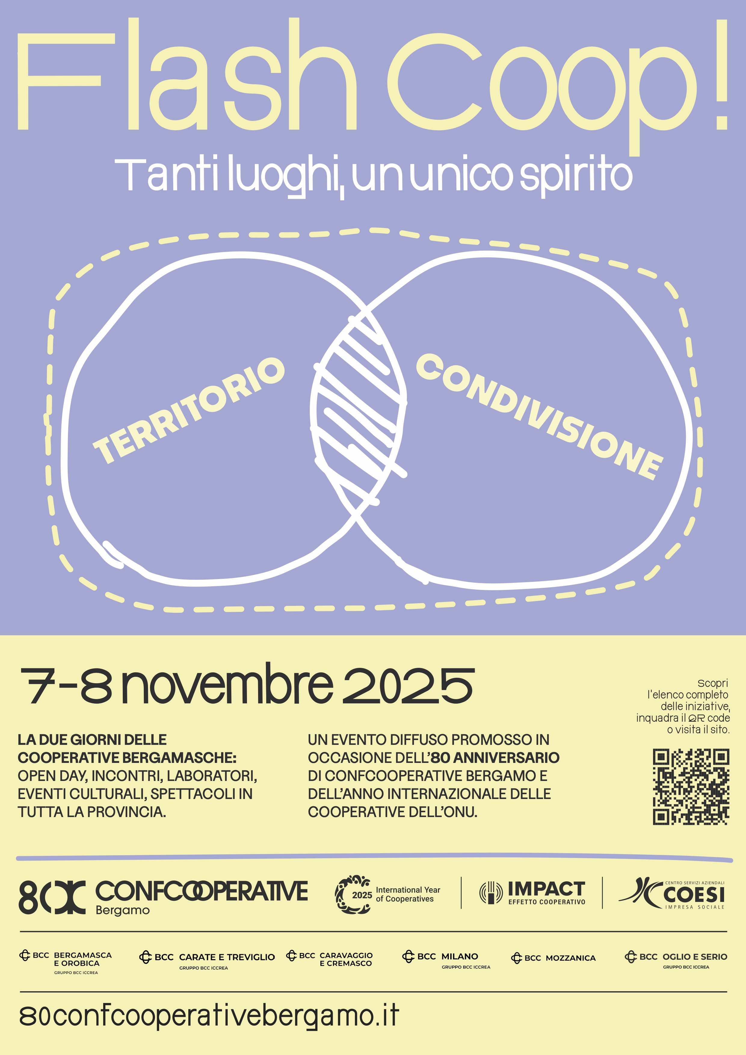 Venerdì 7 e sabato 8 novembre il territorio orobico sarà attraversato da Flash Coop!, la due giorni delle cooperative bergamasche. Un evento diffuso che raccoglie laboratori di economia circolare e sostenibilità ambientale, mostre e percorsi artistici inclusivi, convegni e momenti formativi, spettacoli teatrali ed eventi musicali. Il tutto organizzato dalle cooperative aderenti a Confcooperative Bergamo e promosso in occasione dell’80° anniversario dell’associazione e dell’Anno Internazionale delle Cooperative ONU.