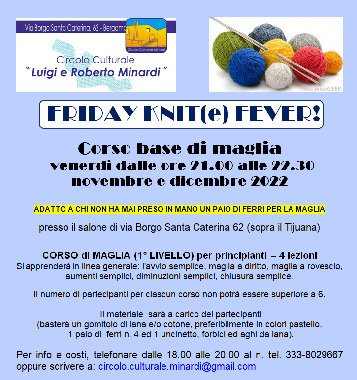 Si comincia con quattro lezioni di corso di maglia (1° livello) per principianti. Si apprenderà in linea generale l'avvio semplice, maglia a diritto e rovescio, aumenti e diminuzioni semplici, chiusura semplice.