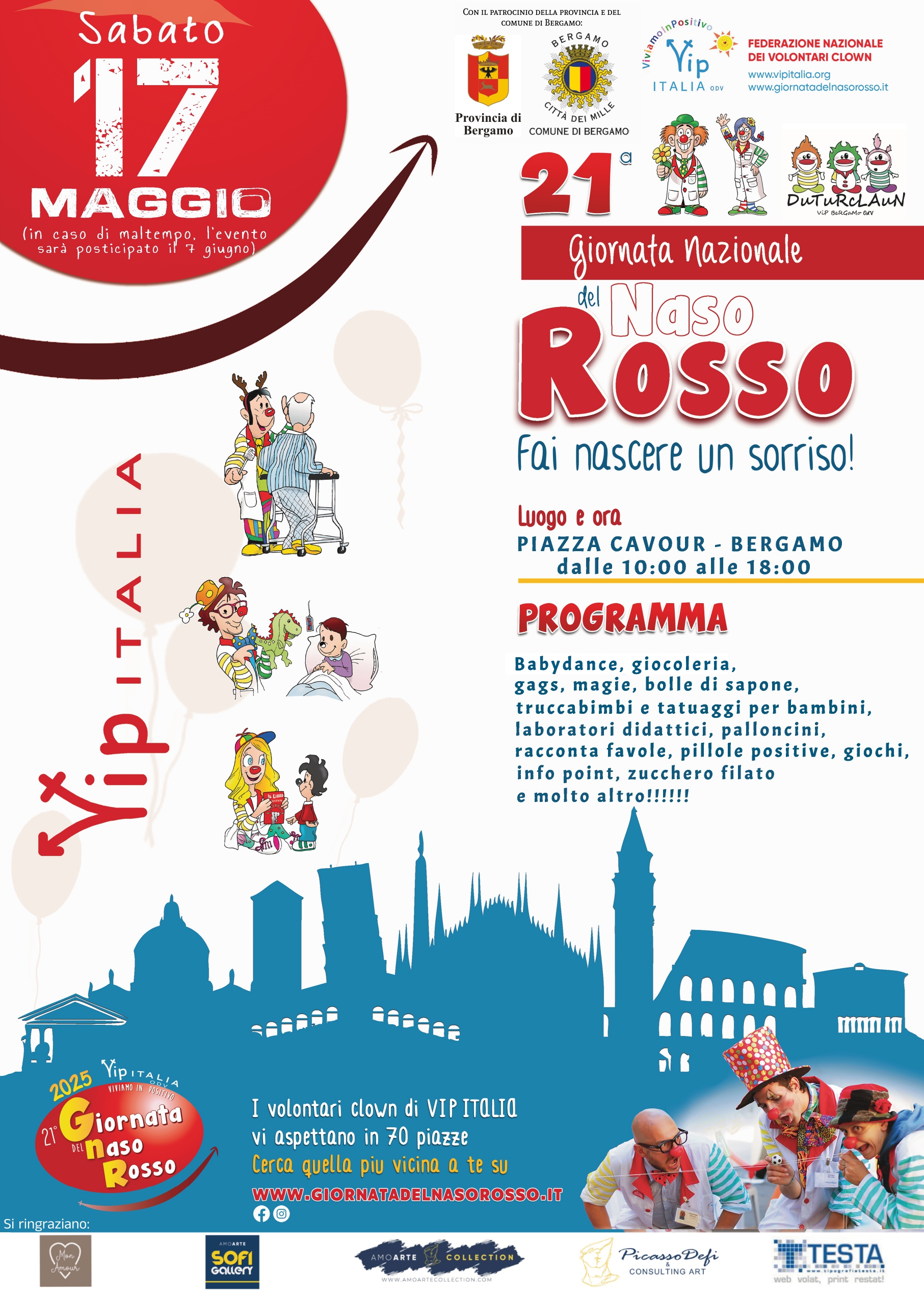 La Giornata del Naso Rosso, arrivata alla sua 21esima edizione, è l'evento che, a livello nazionale, fa scendere in piazza i volontari claun delle Associazioni appartenenti alla Federazione VIP Viviamo In Positivo Italia ODV, con lo scopo di sensibilizzare l’opinione pubblica al volontariato clown. In piazza Cavour sarà allestito un infopoint presso il quale si potranno ricevere informazioni sulle attività che svolgiamo e come fare per entrare a far parte della nostra Associazione. Dutur Claun VIP Bergamo ODV, costituitasi nel 2002, è un'associazione di volontariato presente attivamente nella Provincia di Bergamo per portare il sorriso in strutture ospedaliere, Residenze Sanitarie Assistenziali, Centri Diurni Anziani, carceri, scuole e altre realtà del territorio bergamasco, oltre che in Missioni e Progetti in Italia e all’estero. Durante la GNR i volontari claun intratterranno grandi e piccini con balli, musica, giochi, numeri di magia/giocoleria, gag, raccontafavole, laboratori per bambini, tatuaggi e truccabimbi, bolle di sapone e distribuzione di pensieri positivi oltre che di zucchero filato. Sul posto i passanti potranno effettuare delle donazioni da destinare ai nostri progetti federativi e locali.'