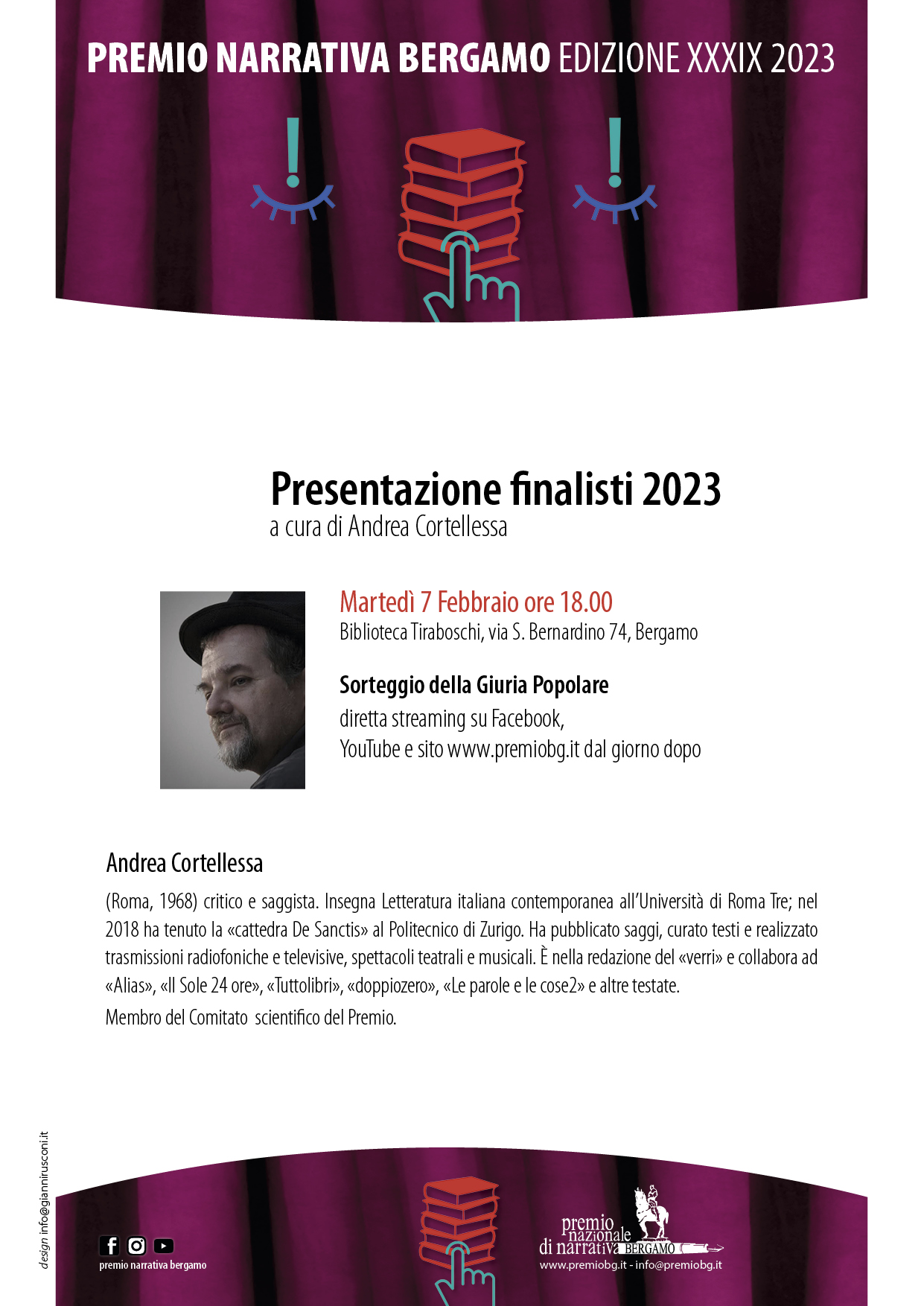 Le cinque opere in concorso verranno presentate dal noto critico e saggista Andrea Cortellessa, membro del Comitato Scientifico, Martedì 7 febbraio alle ore 18.00 presso la Biblioteca Tiraboschi, quest’anno in presenza.
