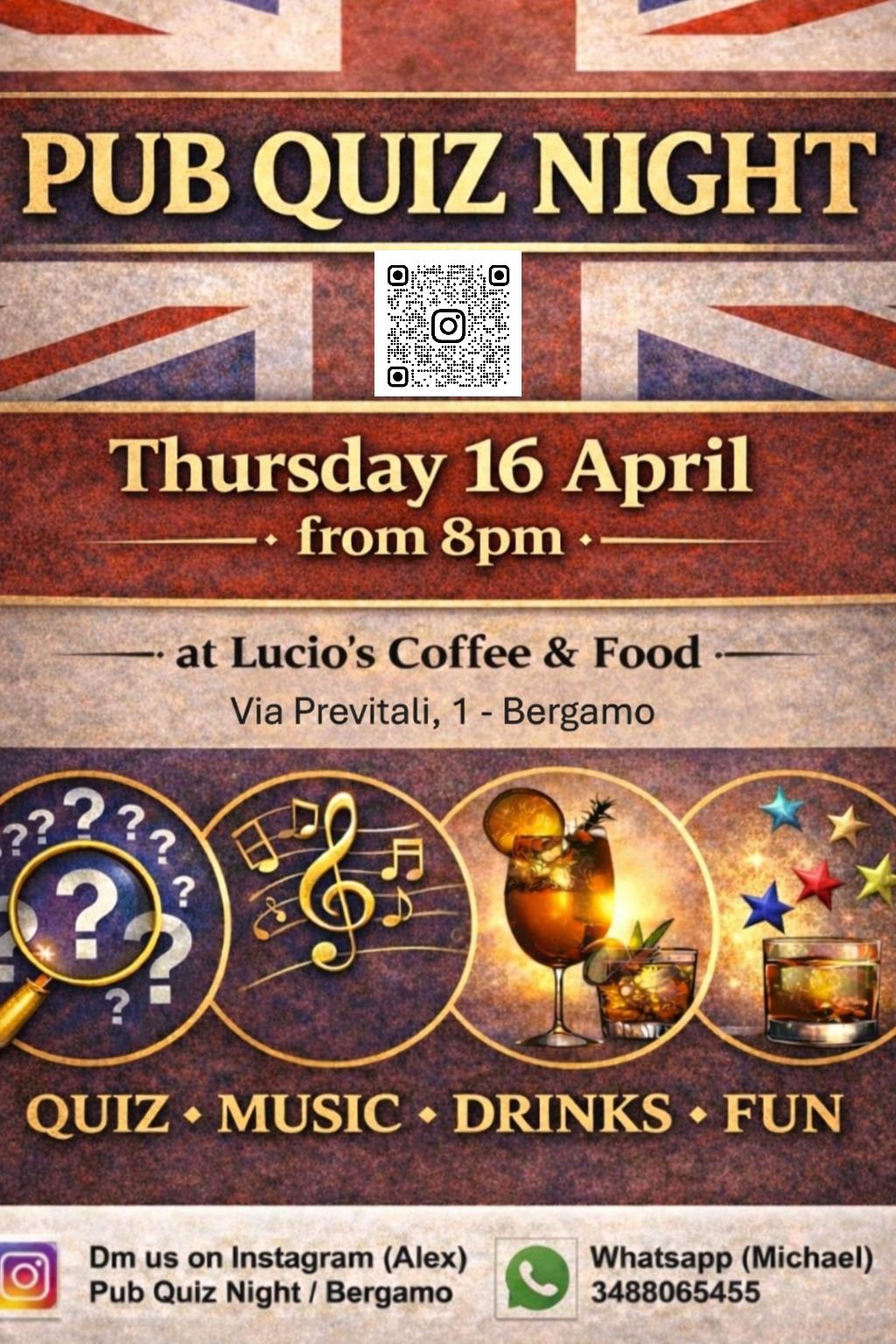 Un Pub Quiz interamente in inglese ogni due settimane. Il conduttore Michael รจ australiano, aiutato dal suo amico Alex (bergamasco con lunga esperienza in UK).