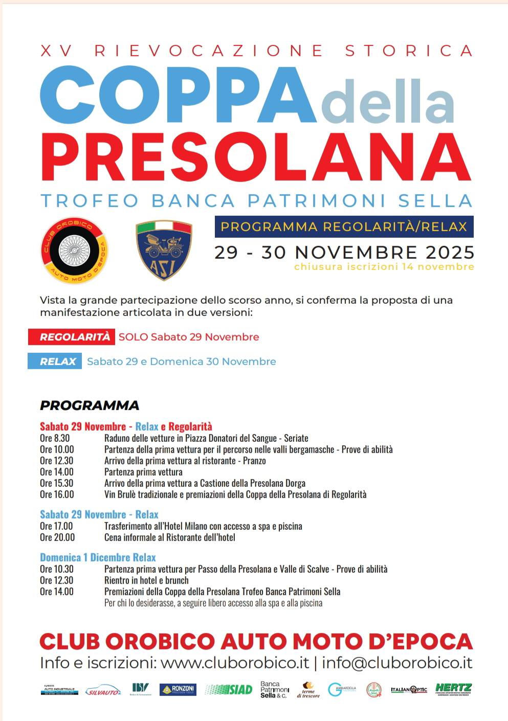 - Domenica 30 novembre: Percorso verso il Passo della Presolana e la Valle di Scalve, inclusivo di prove di abilità, e conclusione con brunch e la cerimonia di premiazione della Coppa della Presolana Trofeo Banca Patrimoni Sella.
