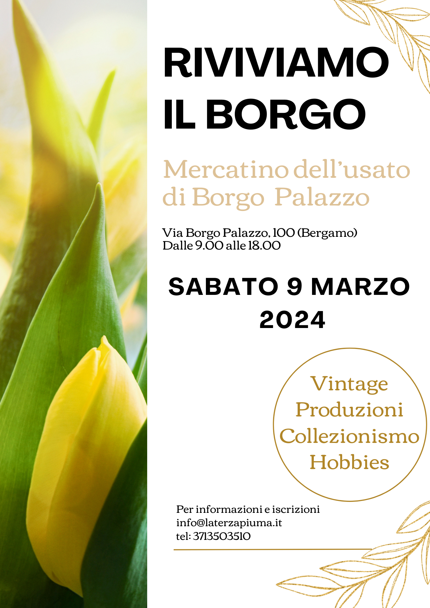Nuovo appuntamento con la Terza Piuma che, ogni secondo e quarto sabato del mese, organizza a Borgo Palazzo il mercato dell'usato dove è possibile dare nuova vita a oggetti ancora in buono stato.