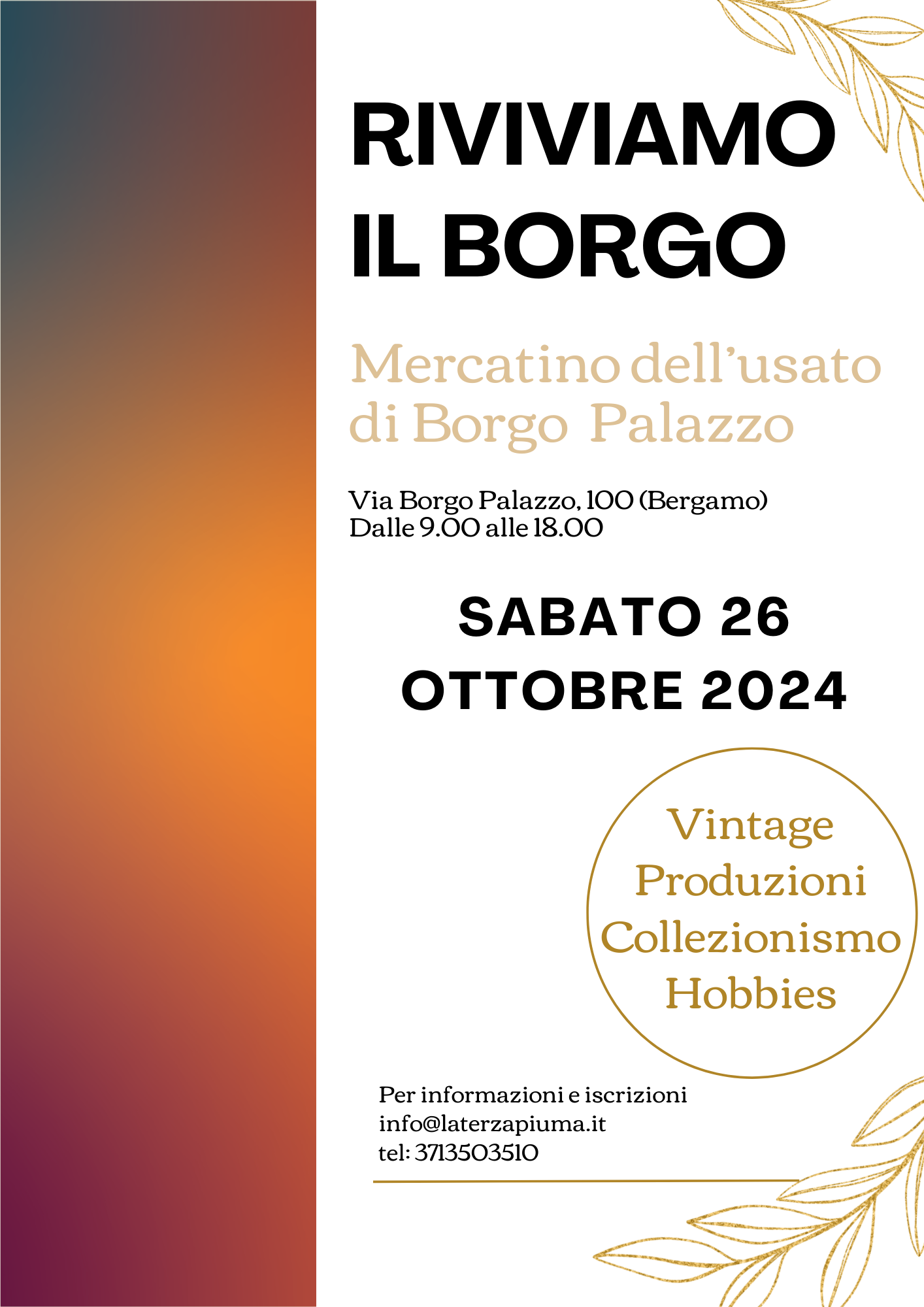 Nuovo appuntamento con la Terza Piuma che, ogni secondo e quarto sabato del mese, organizza a Borgo Palazzo il mercato dell'usato dove è possibile dare nuova vita a oggetti ancora in buono stato.