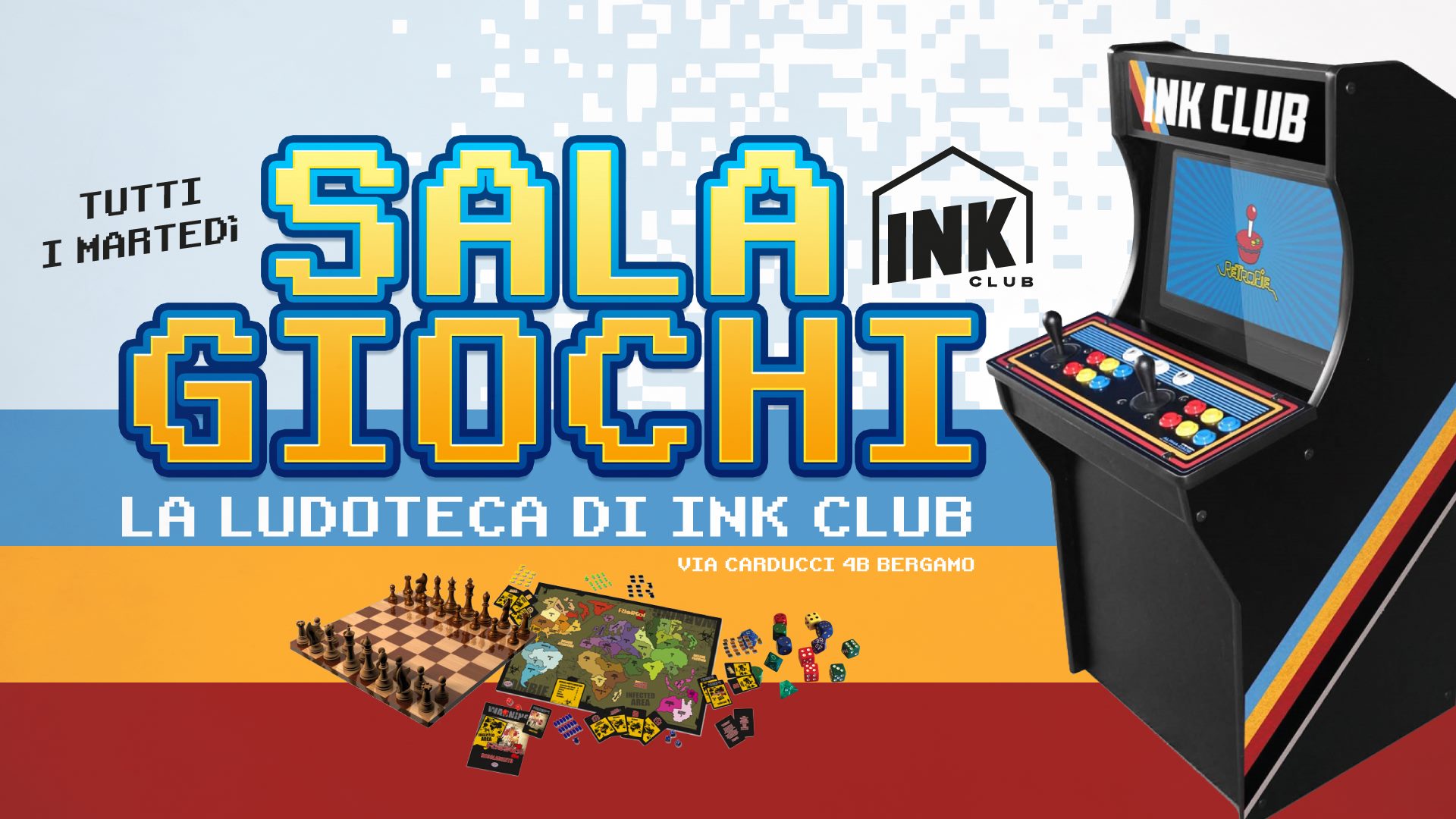 L'ink club metterà a disposizione una lista di giochi (calcetto, biliardo, e tanti altri) e la nuovissima sala giochi, ma ognuno può portare e/o donare i suoi giochi per amplificare il divertimento e la ludoteca!