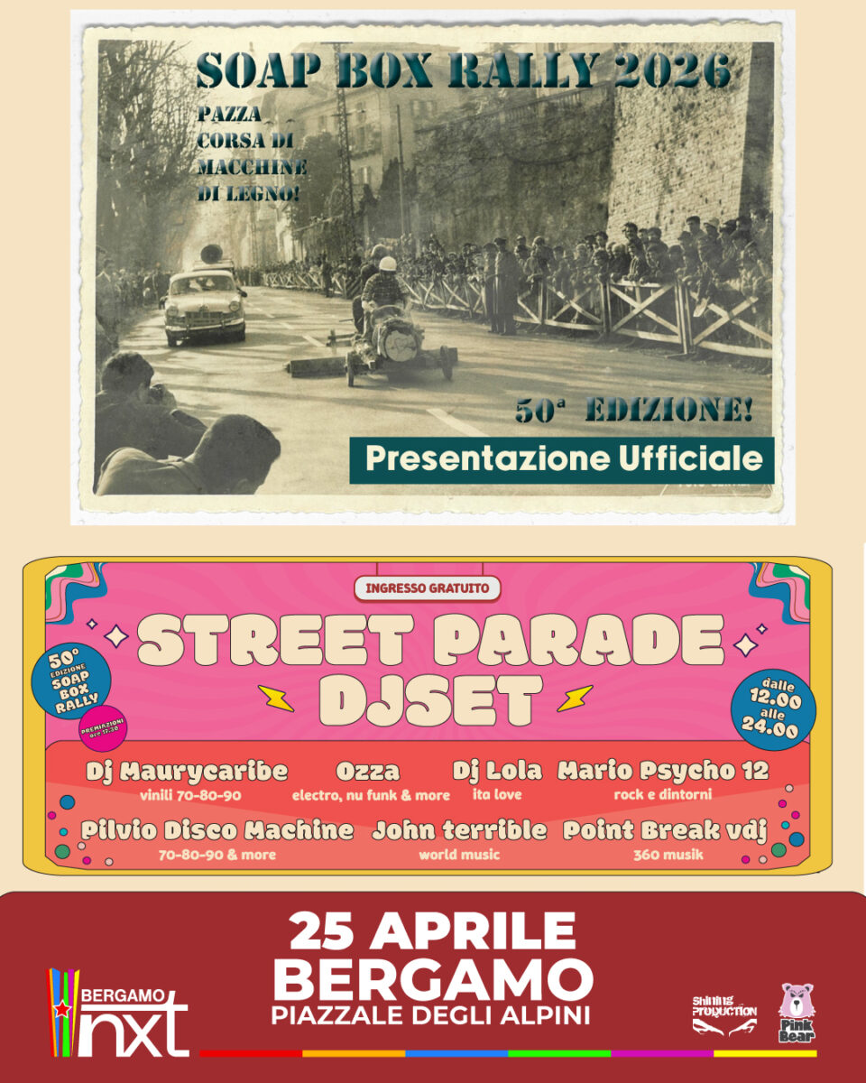 In occasione del 25 aprile, NXT Bergamo ospita una giornata speciale che unisce tradizione, creativitร e intrattenimento musicale nel cuore della cittร . Presso Piazzale degli Alpini arriva infatti la presentazione ufficiale e la punzonatura delle macchine di legno della 50a edizione del Soap Box Rally, storico evento organizzato da Proloco Bergamo in collaborazione con ASD Box Rally.