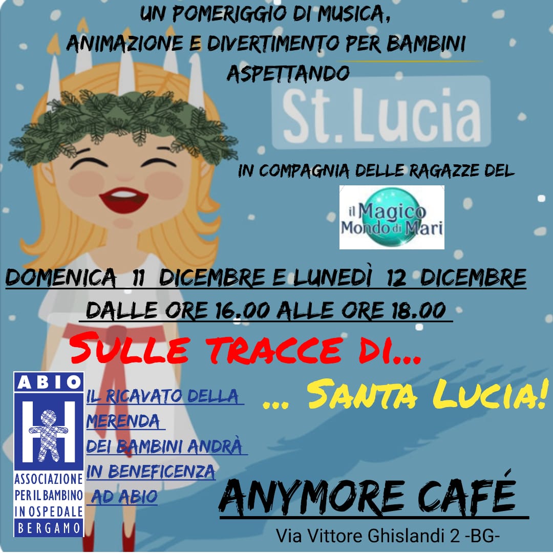 Un pomeriggio di musica, animazione e divertimento per bambini aspettando Santa Lucia. Il ricavato della merenda dei bambini andrà in beneficienza ad ABIO.