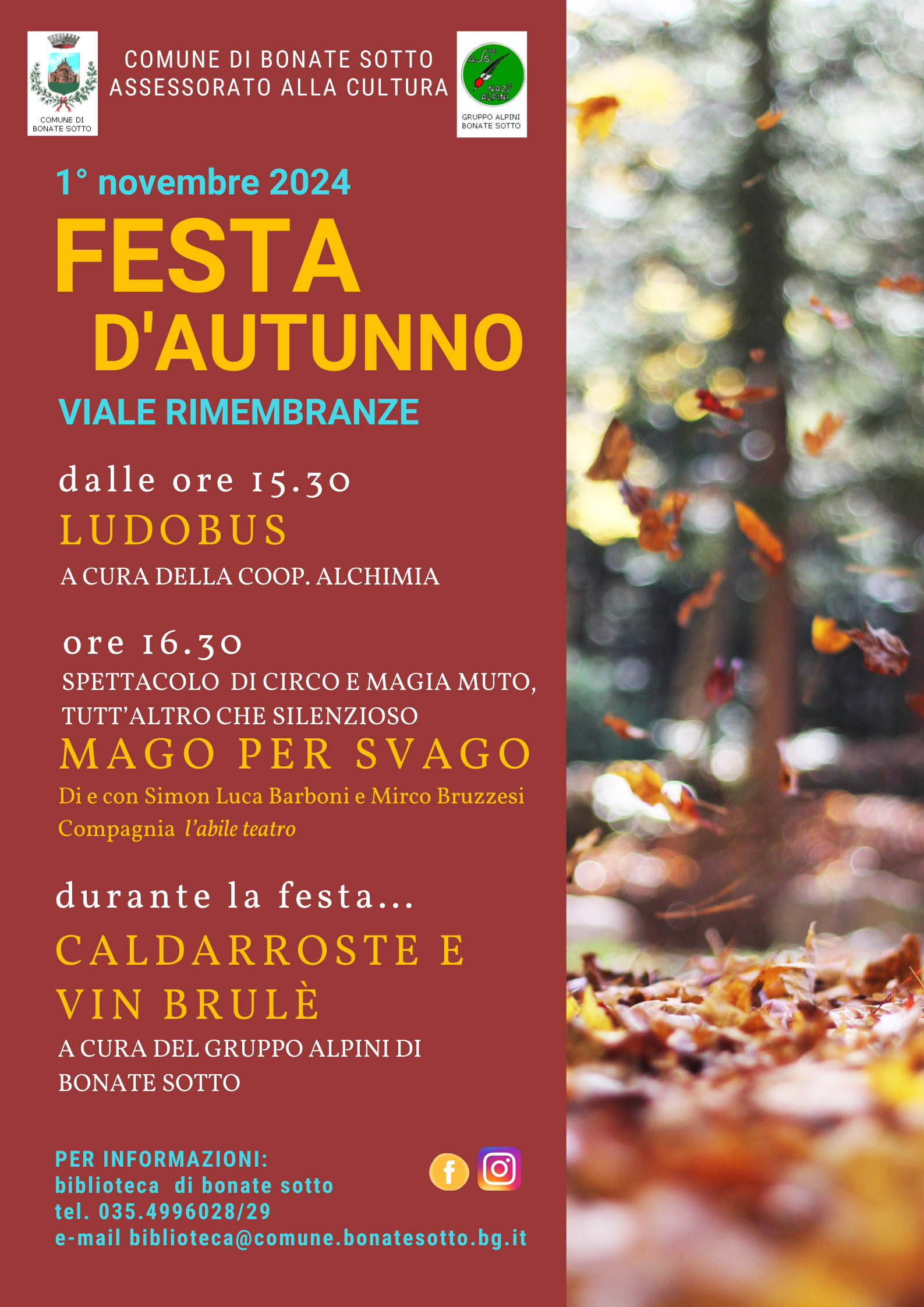 Torna la Festa d’autunno a Bonate Sotto... il prossimo 1° novembre appuntamento in Viale Rimembranze per festeggiare con i giochi del Ludobus della Cooperativa Alchimia e animazioni di strada a cura di L’abile Teatro. Saranno presenti anche gli Alpini con caldarroste e Vin brulè.