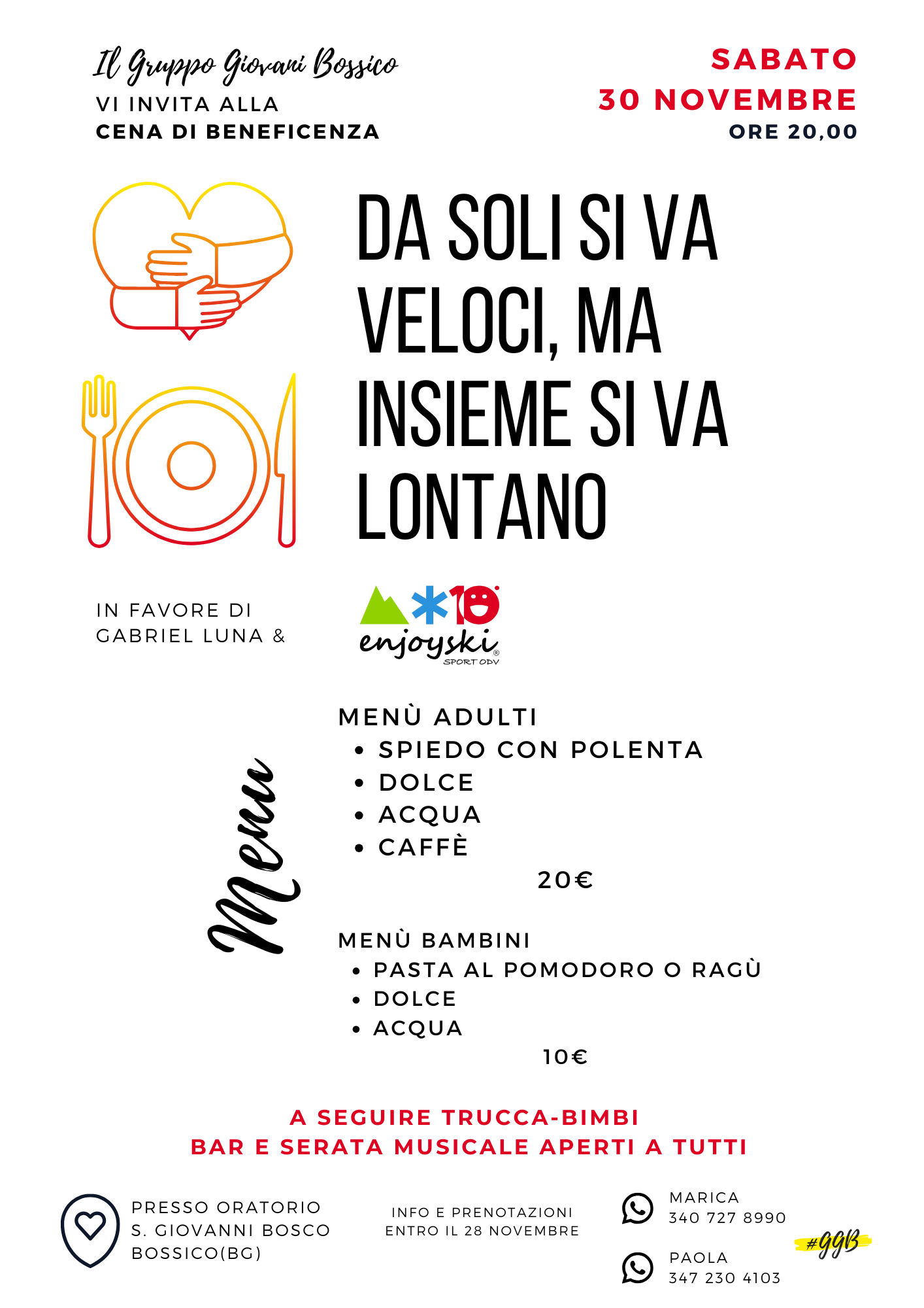 Da soli si va veloci, ma insieme si va lontano: presso l'oratorio di Bosscico cena e serata di beneficenza, in favore di Gabriel Luna e ENJOYSKI.