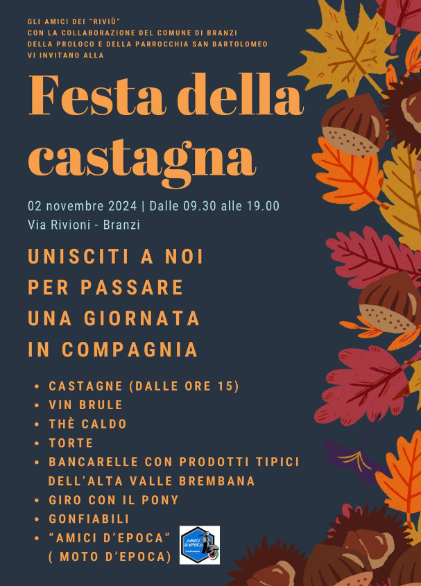 Venite a Branzi e immergetevi nella calda atmosfera della Festa della Castagna! Gli Amici dei "Riviù", in collaborazione con il Comune di Branzi, la Pro Loco e la Parrocchia, vi invitano a una giornata all'insegna del gusto e del divertimento. Dalle 9:30 del 2 novembre, vi aspettano castagne calde, vin brulè, dolci fatti in casa, bancarelle con prodotti tipici, giro con il pony, moto d'epoca e tante altre sorprese! Un'occasione perfetta per trascorrere una giornata in compagnia e assaporare i sapori autentici dell'autunno.