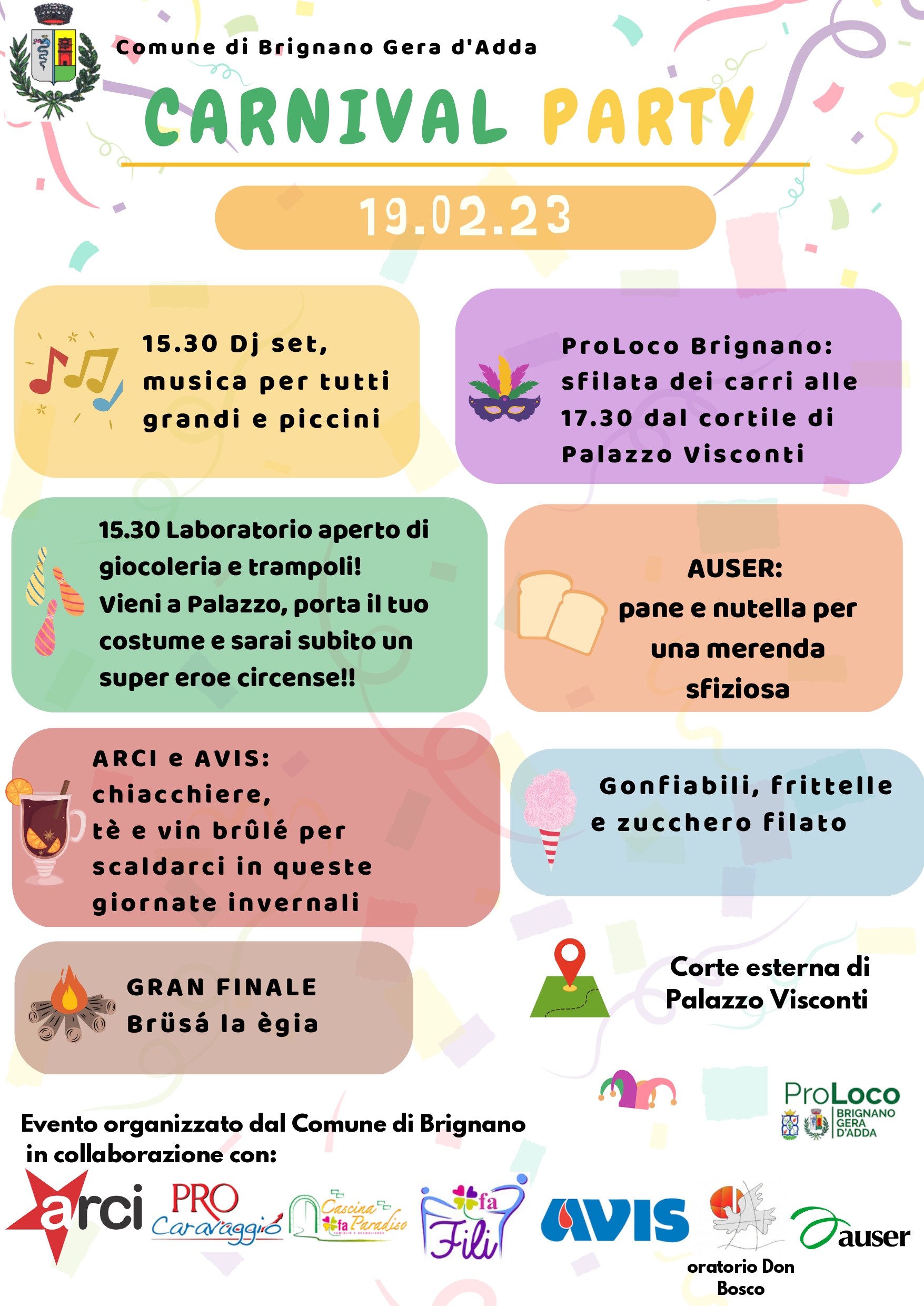 Durante l'evento ci sarà un Dj set per grandi e piccoli, sarà presente un laboratorio di giocoleria. Arci e Avis vi faranno gustare chiacchere, tè e vin brulé . Alle 17.30 nel cortile del palazzo, sarà possibile ammirare i carri deliziandosi anche con frittelle e zucchero filato. Per la gioia dei più piccini saranno presenti anche dei bellissimi gonfiabili.