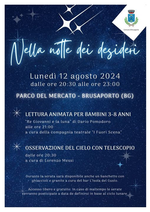 La serata sarà introdotta alle 21 dalla lettura animata "Re Giovanni e la luna" di Dario Pomodoro per i bambini dai 3 agli 8 anni, a cura della compagnia teatrale “I Fuori Scena”.