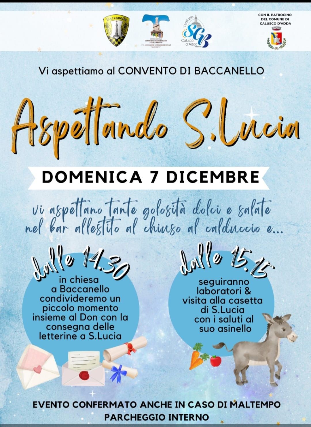 La manifestazione è pensata per le famiglie e si terrà anche in caso di maltempo. Il pomeriggio si aprirà alle 14:30 con un momento in Chiesa a Baccanello, dove i bambini potranno condividere un piccolo momento insieme al Don e consegnare le loro letterine a S. Lucia.