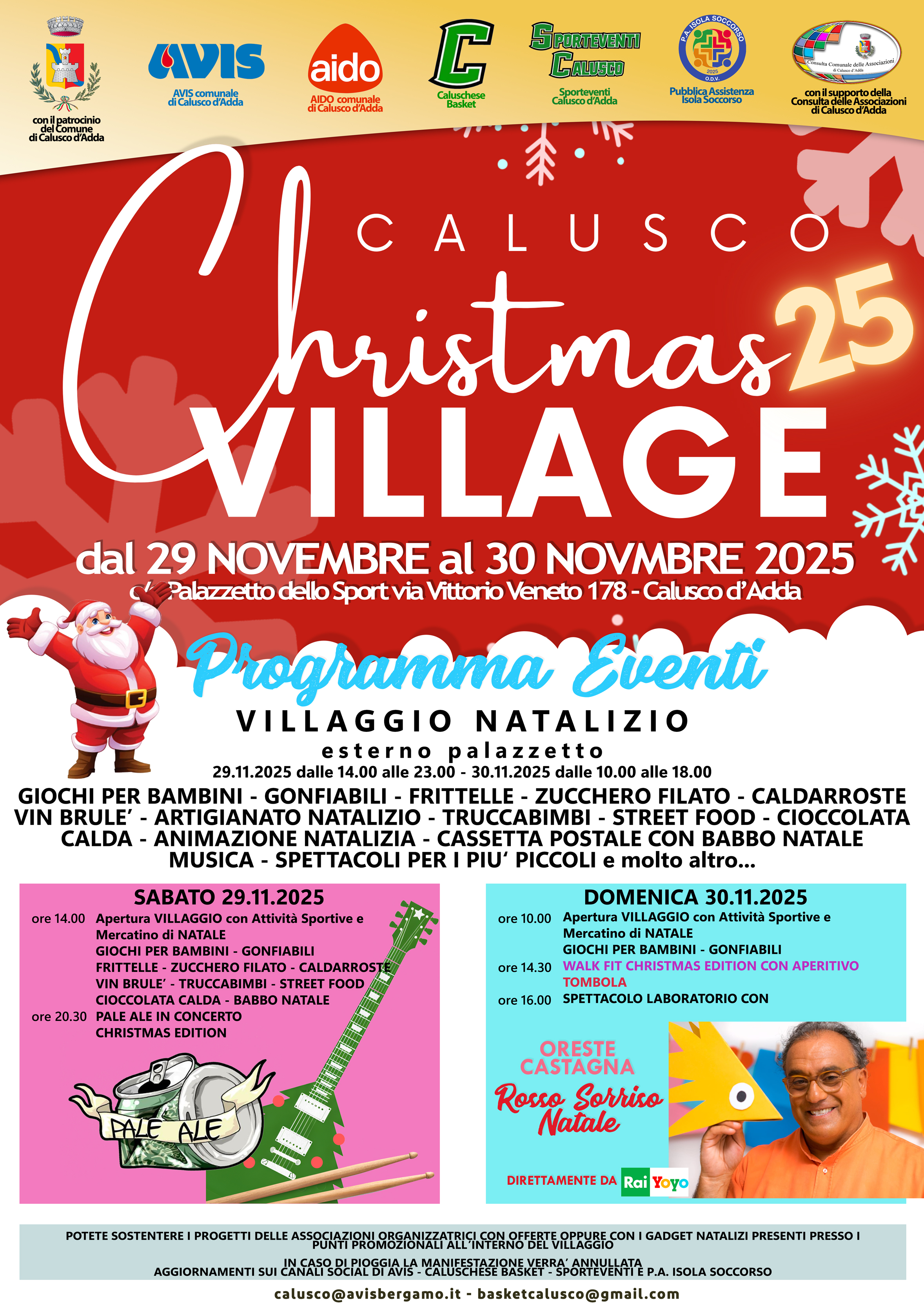 Il Natale vi aspetta a Calusco d'Adda con le Associazioni AVIS, AIDO, Caluschese Basket, Sporteventi, P. A. Isola Soccorso e Comune di Calusco d'Adda.