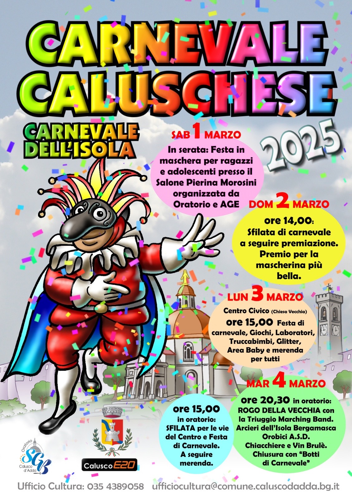 Il Carnevale di Calusco d'Adda torna con quattro giorni di festa e divertimento! Festa in maschera per ragazzi e adolescenti, organizzato dall'oratorio e da AGE per una serata spassosa.