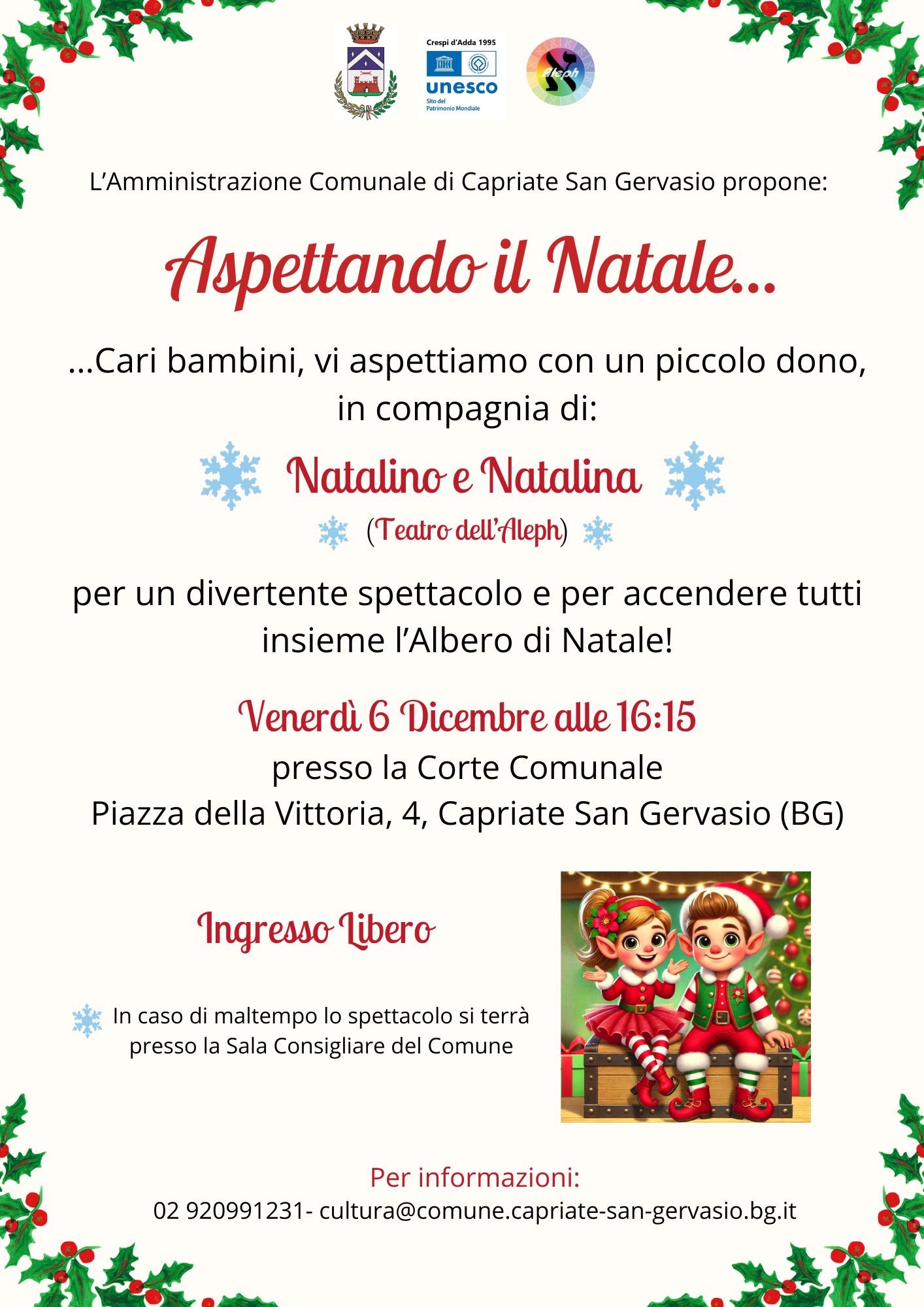 Venerdì 6 dicembre alle ore 16,15 presso la Corte del Comune in Piazza della Vittoria 4, Natalino e Natalina (di Teatro dell'Aleph), con un piccolo dono, accoglieranno i bambini per un divertente spettacolo e per accendere l'Albero di Natale insieme!