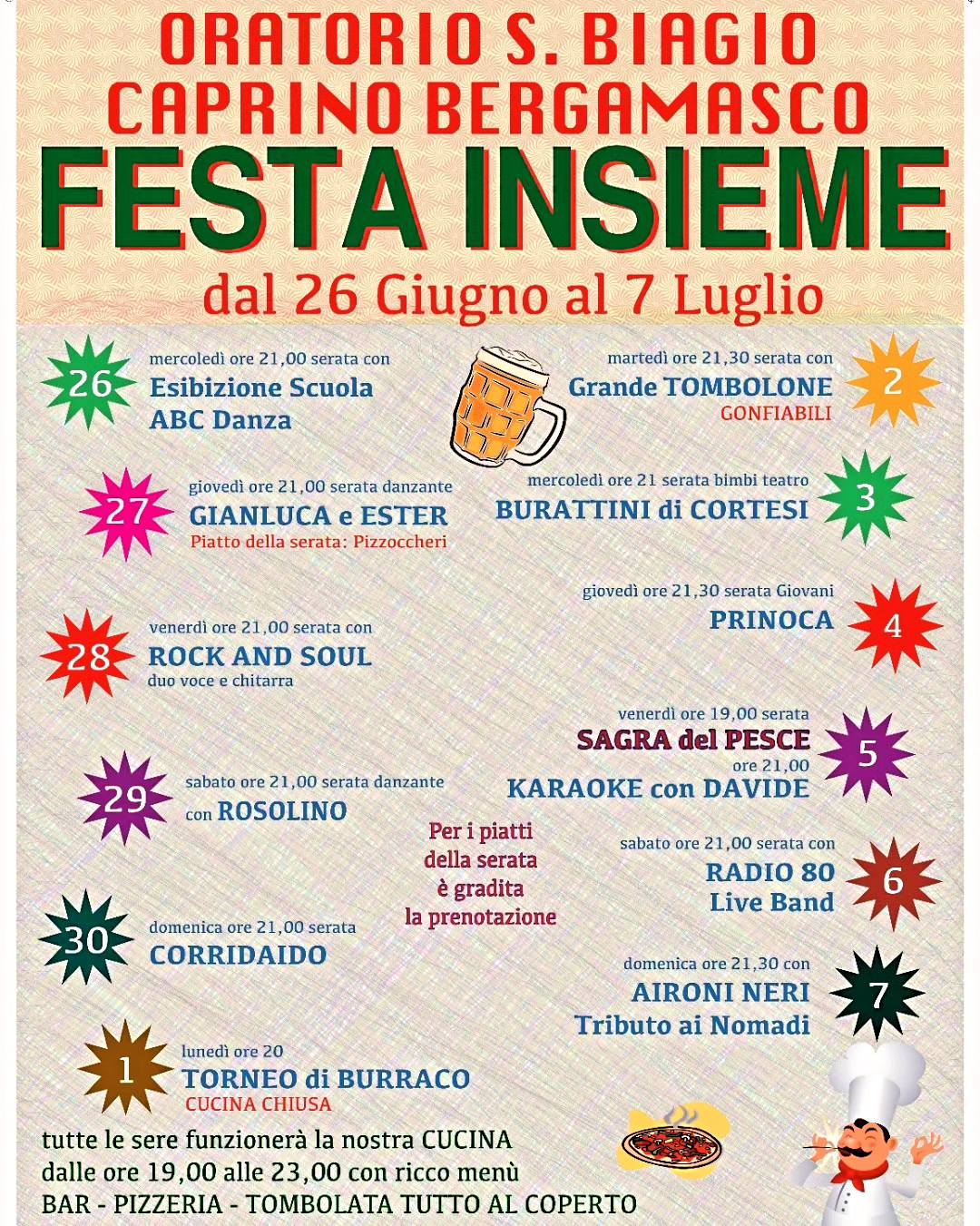 La Festa Insieme a Caprino Bergamasco è in programma dal 26 giugno 2024 al 07 luglio 2024. Tutte le sere la cucina è aperta dalle ore 19:00 fino alle 23:00 con un ricco menù.