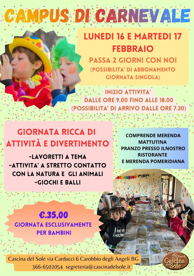 Successivamente, nei giorni di lunedì 16 e martedì 17 febbraio, la cascina propone il Campus di Carnevale, un'esperienza pensata esclusivamente per i bambini che si svolge dalle 9.00 fino alle 18.00, con la possibilità di anticipare l'arrivo alle 7.30.