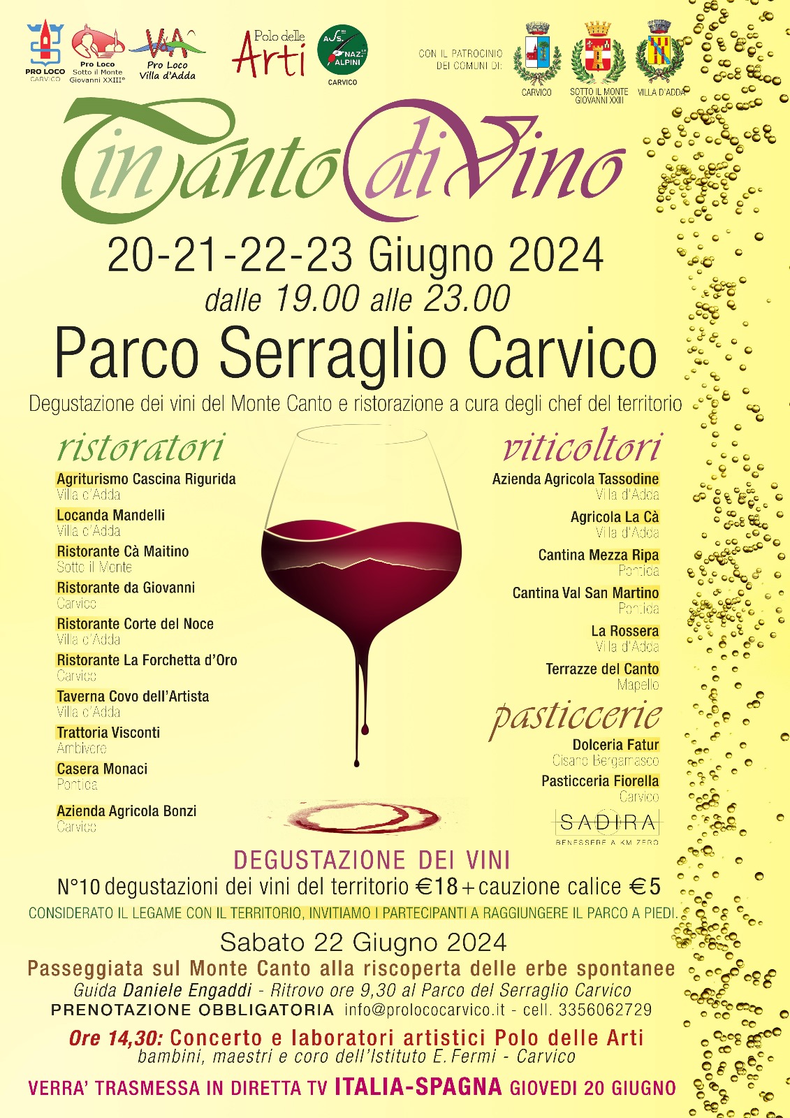 Per la terza edizione dell'InCanto diVino, promossa dalle ProLoco di Sotto il Monte, Carvico e Villa d’Adda, vi aspettiamo all'evento che vede come protagoniste le cantine con i vini del Monte Canto, accompagnati dalle pietanze dei ristoratori del territorio.