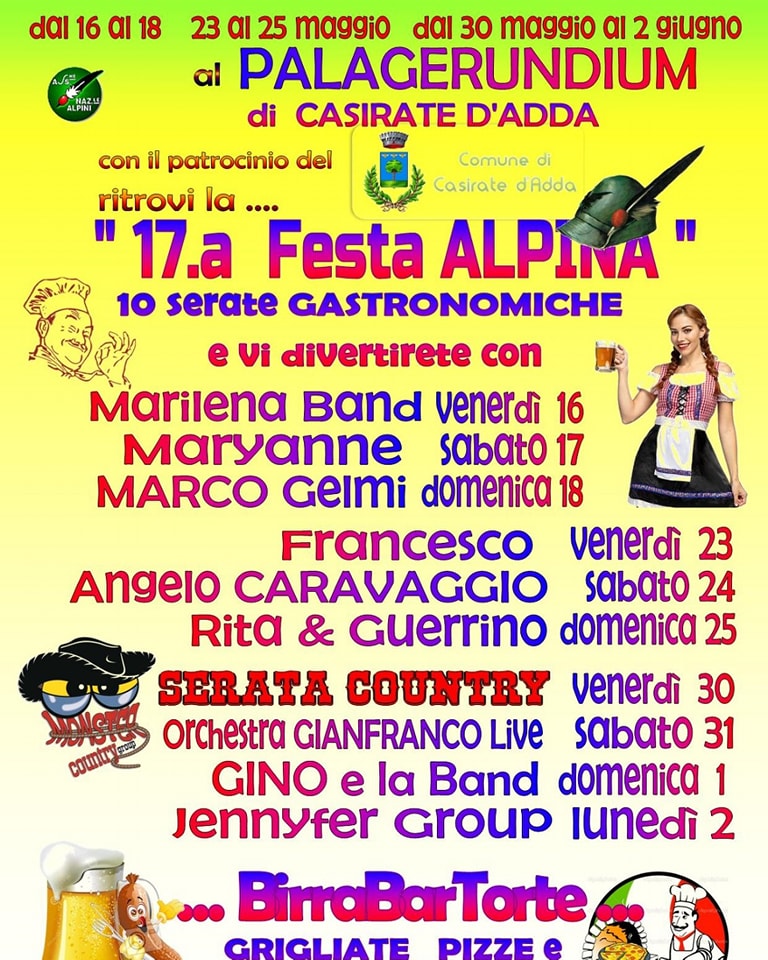 Torna a Casirate d’Adda uno degli appuntamenti più attesi della primavera: la 17esima Festa Alpina, che si svolgerà presso il Palagerundium in Via dell’Industria 15. La manifestazione, patrocinata dal Comune di Casirate d’Adda, si terrà nei weekend del 16-18 maggio, 23-25 maggio e dal 30 maggio al 2 giugno 2025.